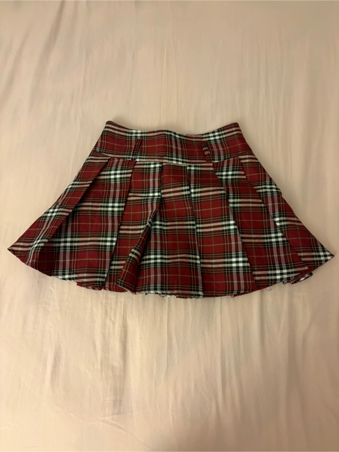 This is a red plaid pleated mini skirt. It's a fun, classic pattern that goes with lots of tops. The fabric feels like a polyester blend. It's great for a casual look or can be dressed up!