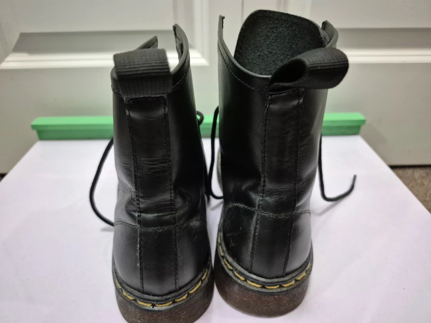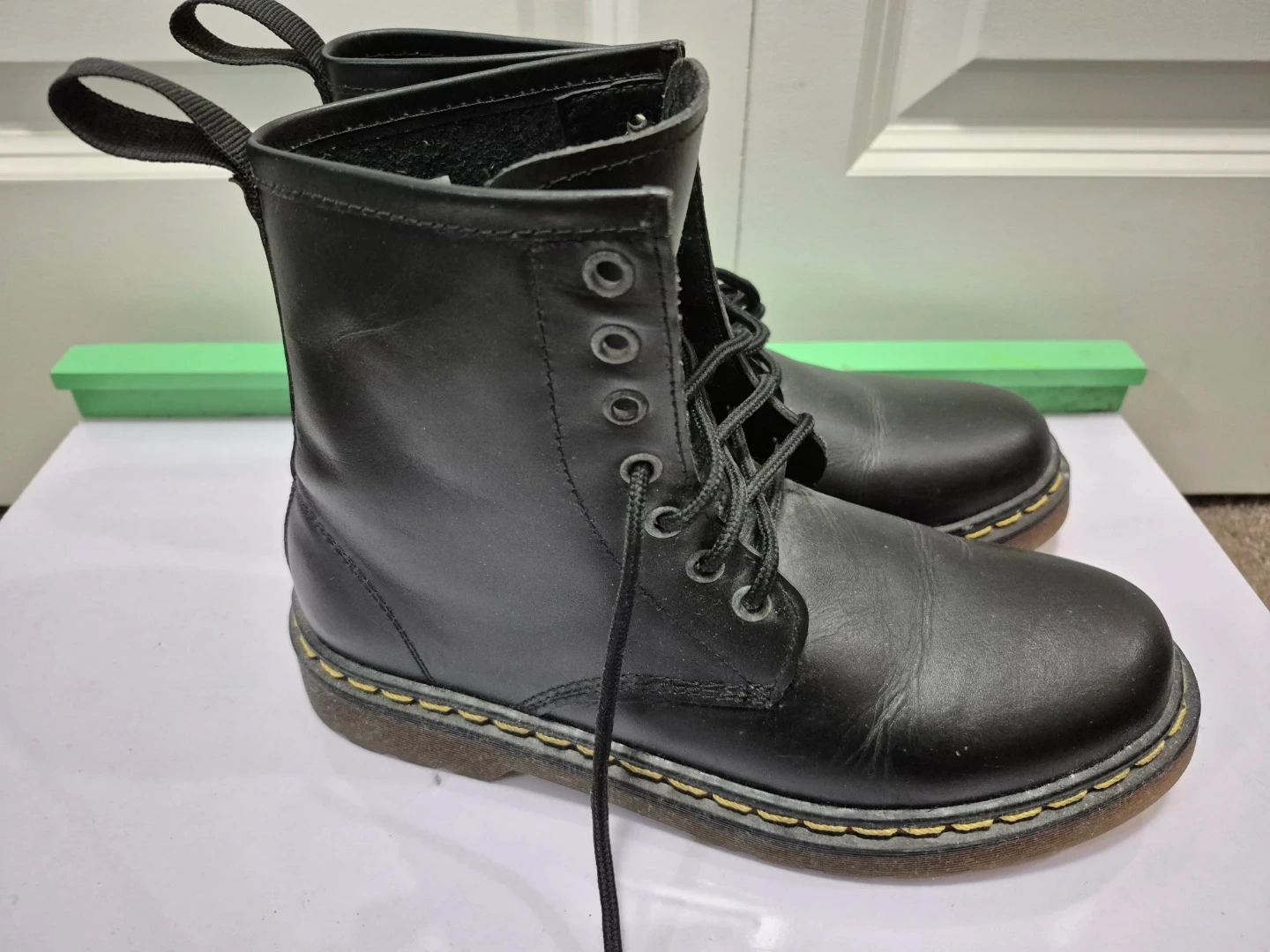 Classic black leather boots. These boots feature durable construction with yellow stitching. They're great for everyday wear and add a bit of an edge to any outfit! Worn once onyl. US SIZE 10 WOMEN. For pick up only