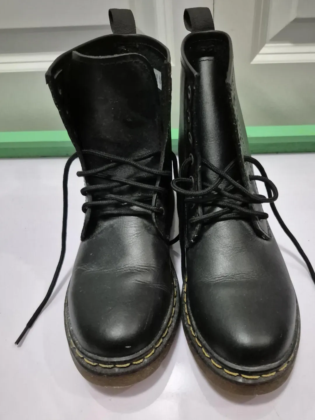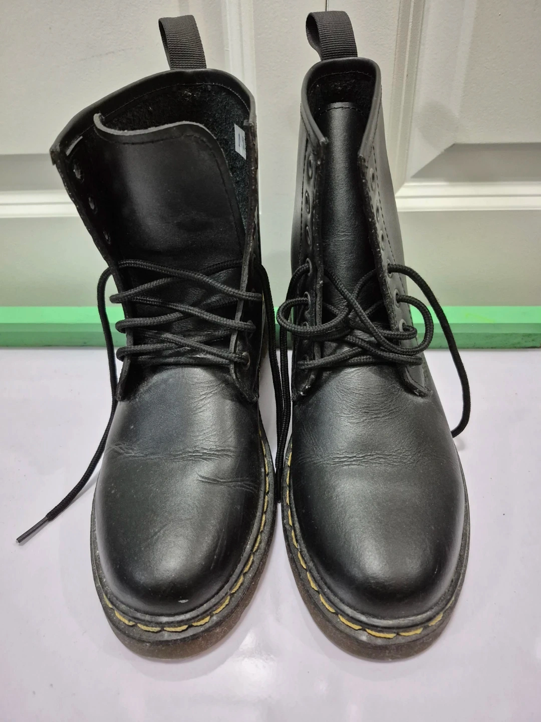 Classic black leather boots. These boots feature durable construction with yellow stitching. They're great for everyday wear and add a bit of an edge to any outfit! Worn once onyl. US SIZE 10 WOMEN. For pick up only