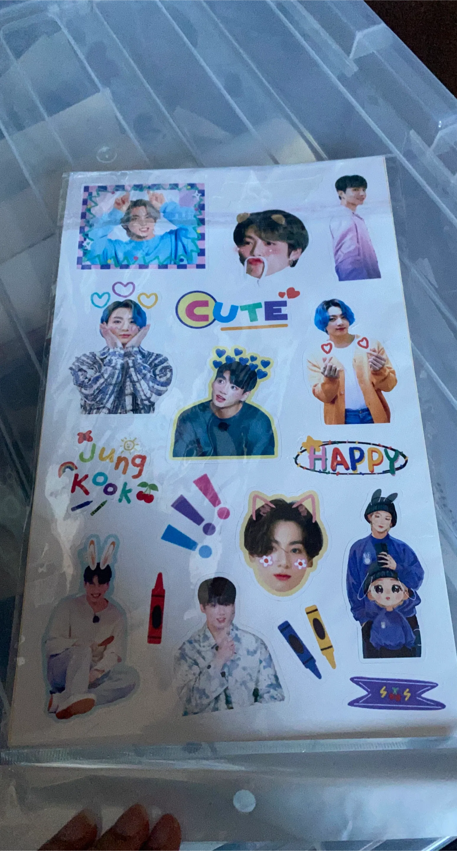 Selling unofficial stickers featuring BTS member Jeon Jungkook . Includes various poses and cute designs like hearts and bunny ears. Perfect for decorating journals, laptops, or personal items!