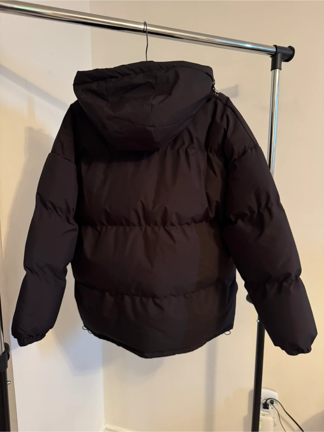 Selling a black puffer jacket in size L. The fabric is 100% polyester and the lining is also 100% polyester. It's in new condition and ready for the colder weather!