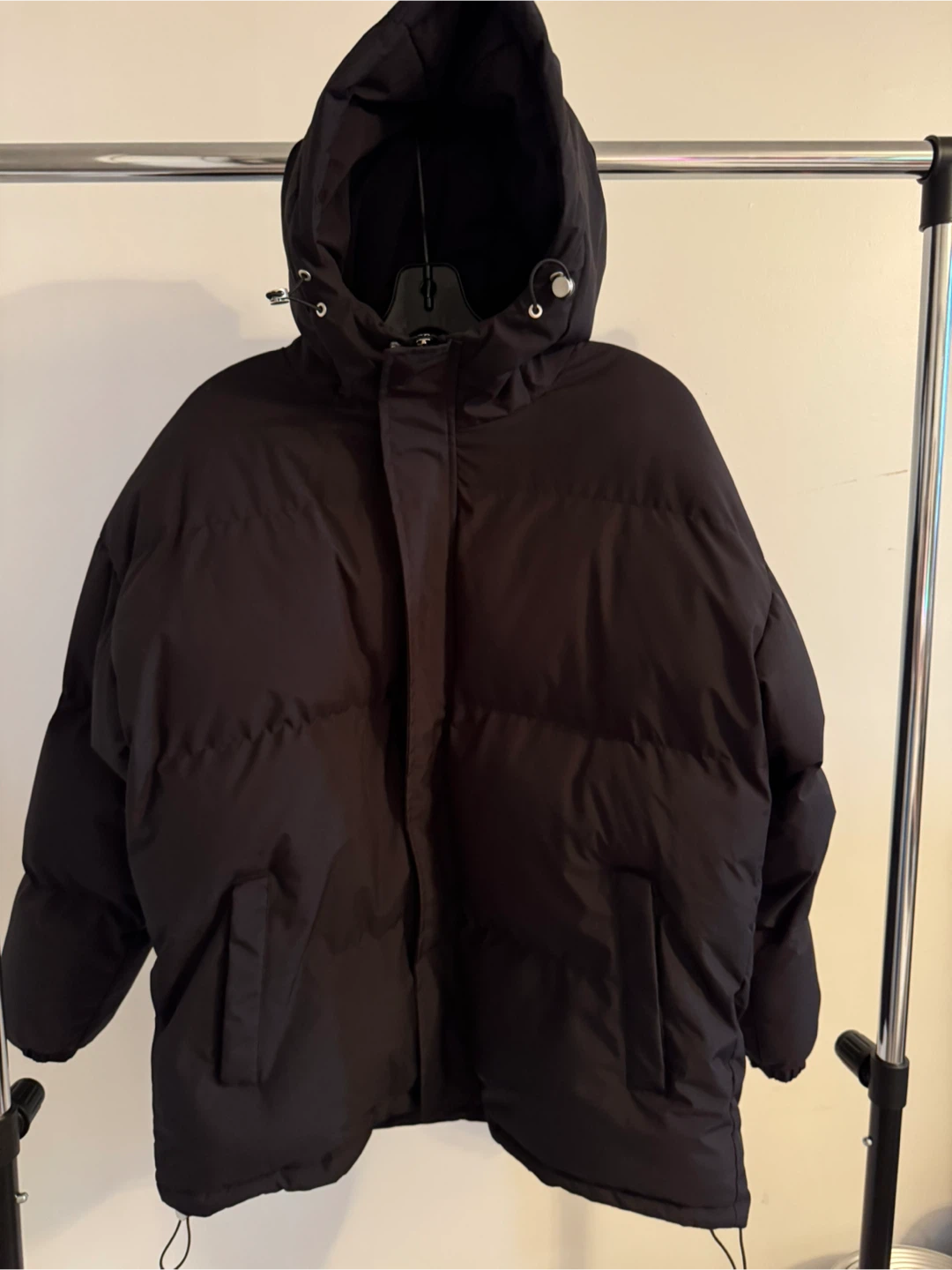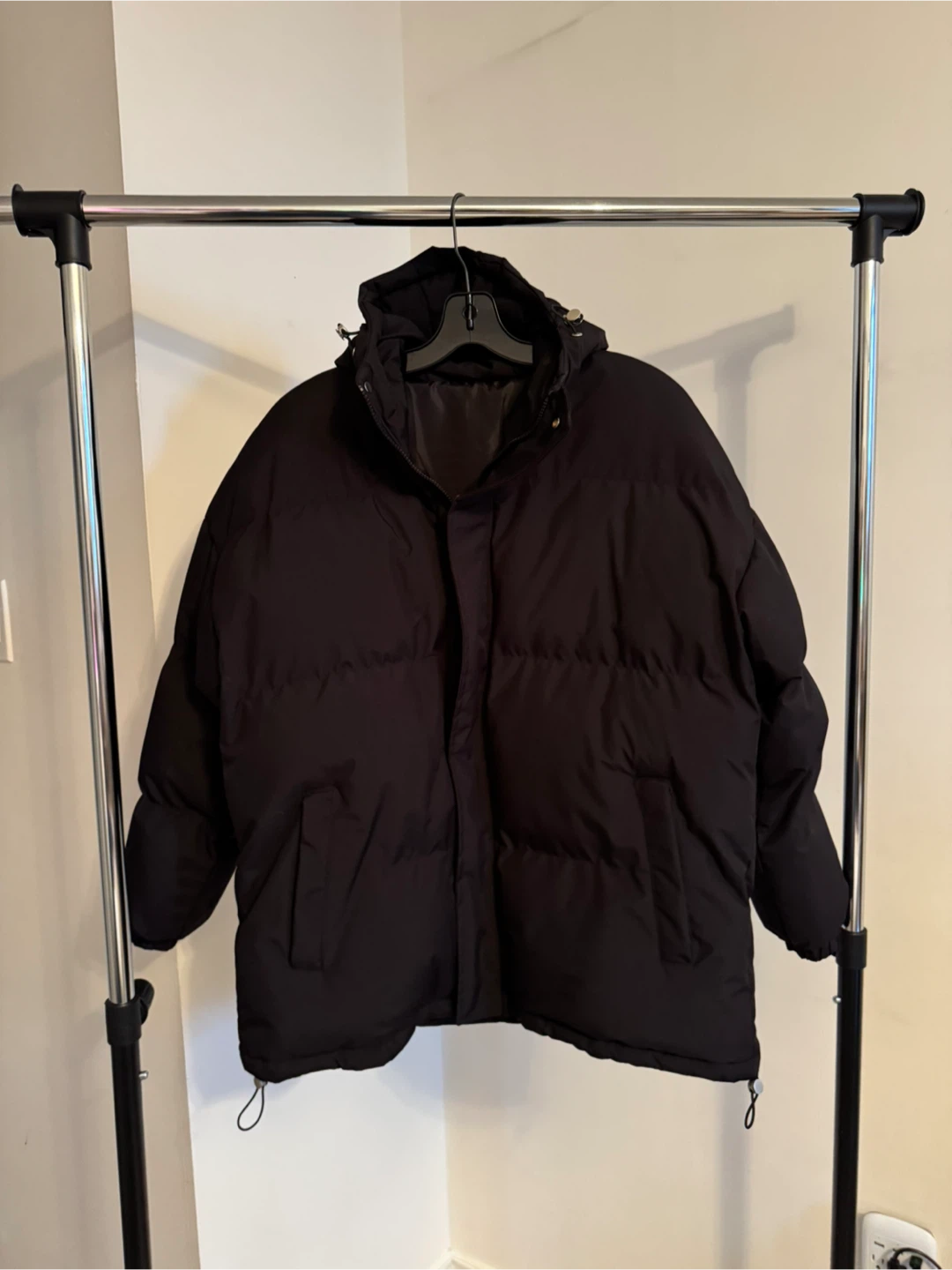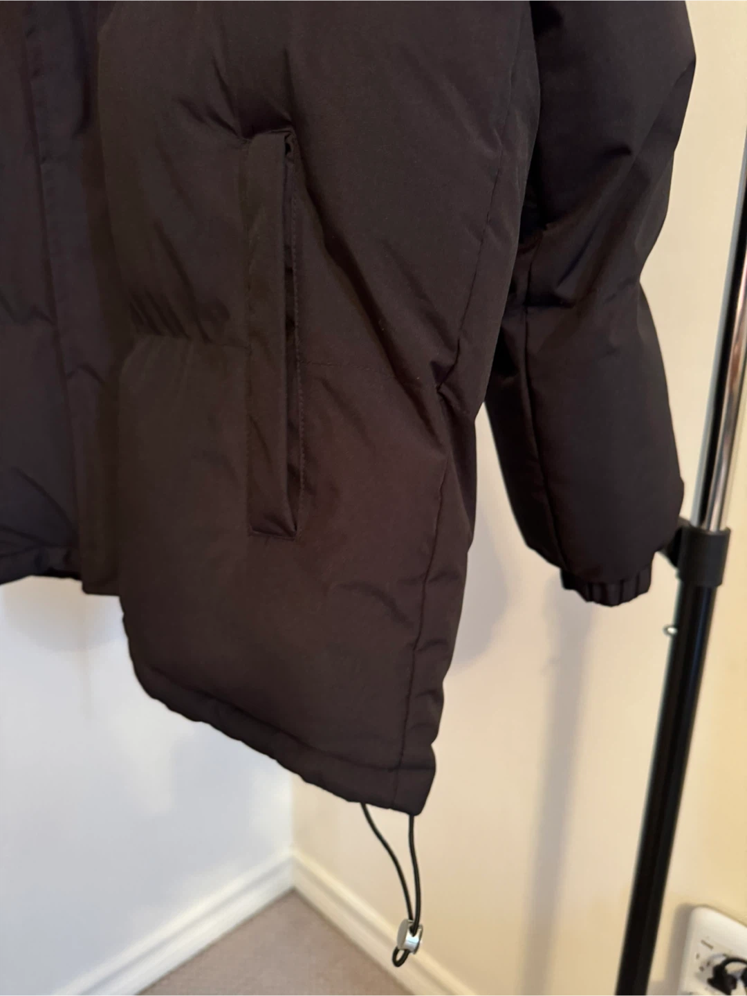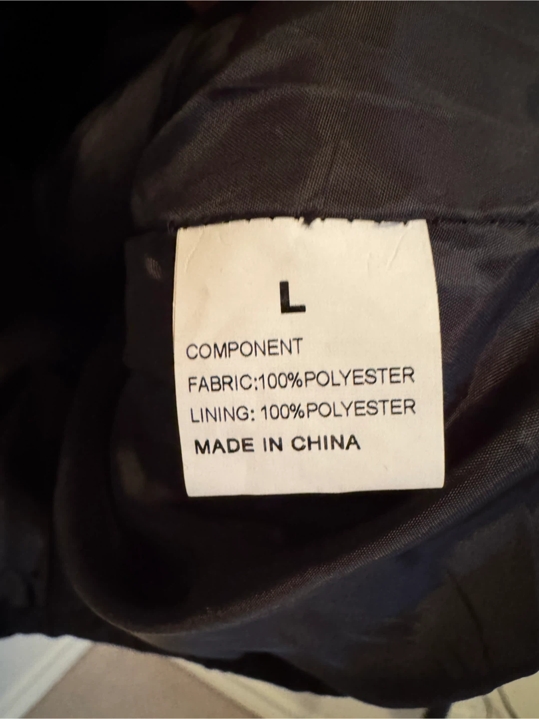 Selling a black puffer jacket in size L. The fabric is 100% polyester and the lining is also 100% polyester. It's in new condition and ready for the colder weather!