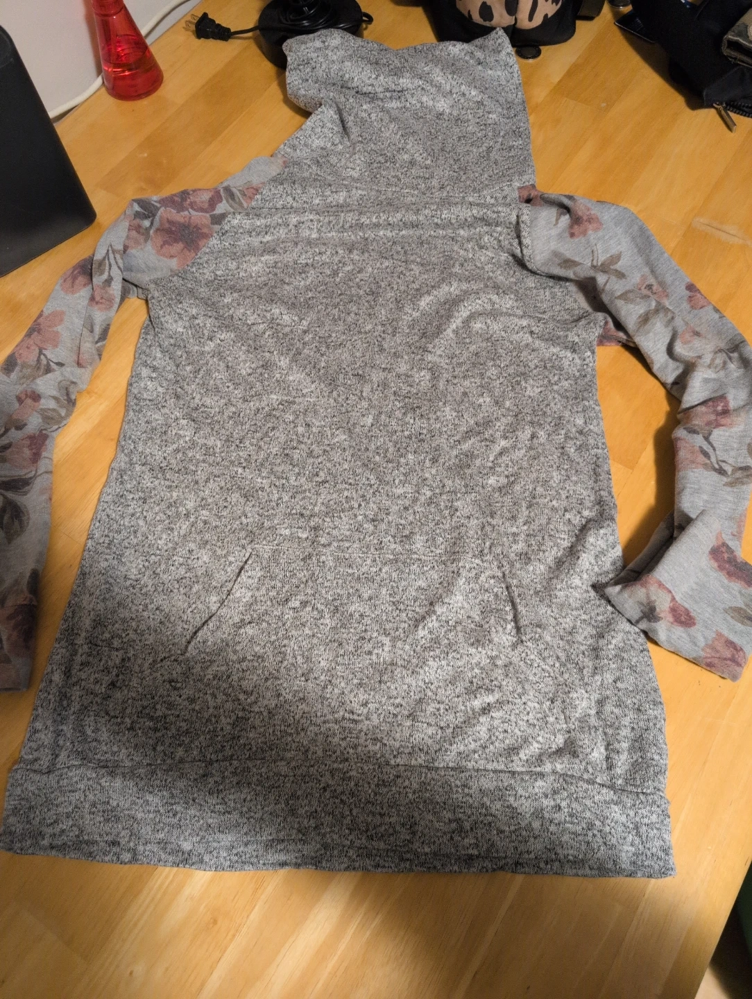 This Eclipse hoodie features a heather grey body with floral print sleeves. It has a drawstring hood and a front kangaroo pocket. Size is XS/TP.