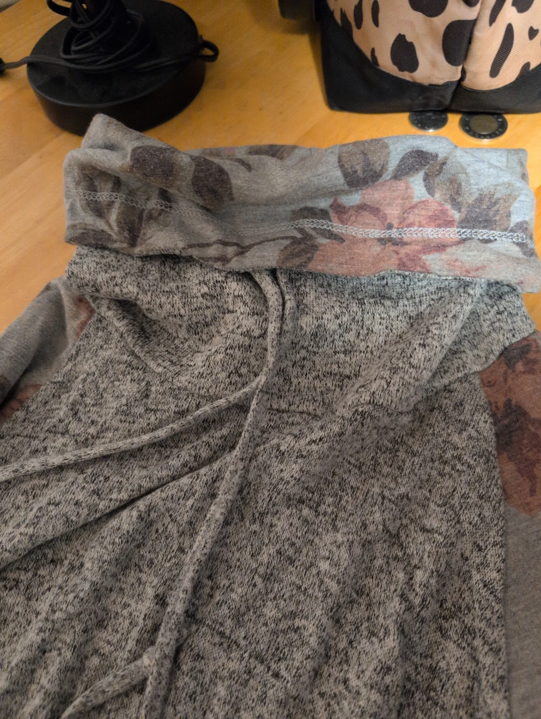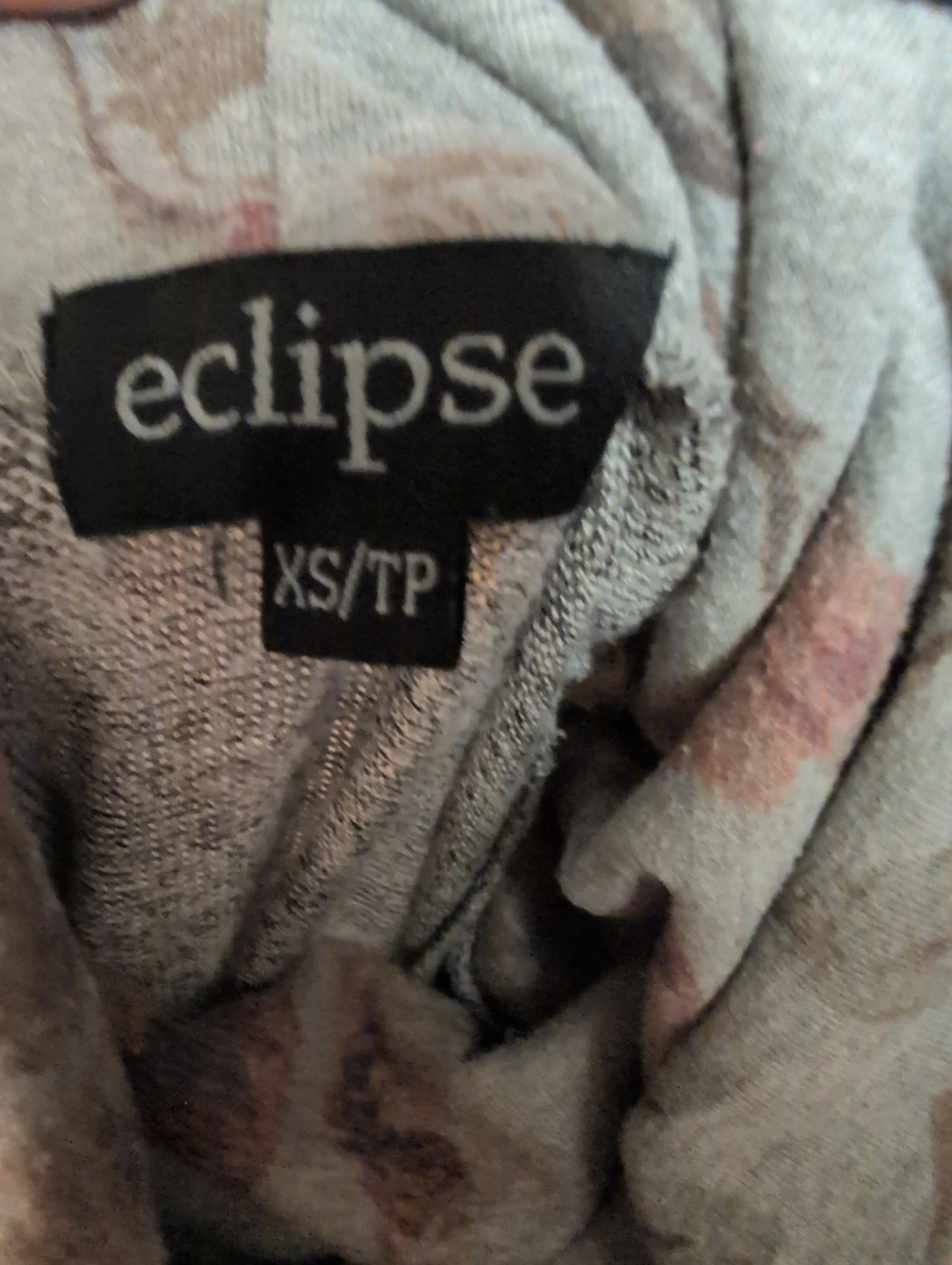 This Eclipse hoodie features a heather grey body with floral print sleeves. It has a drawstring hood and a front kangaroo pocket. Size is XS/TP.