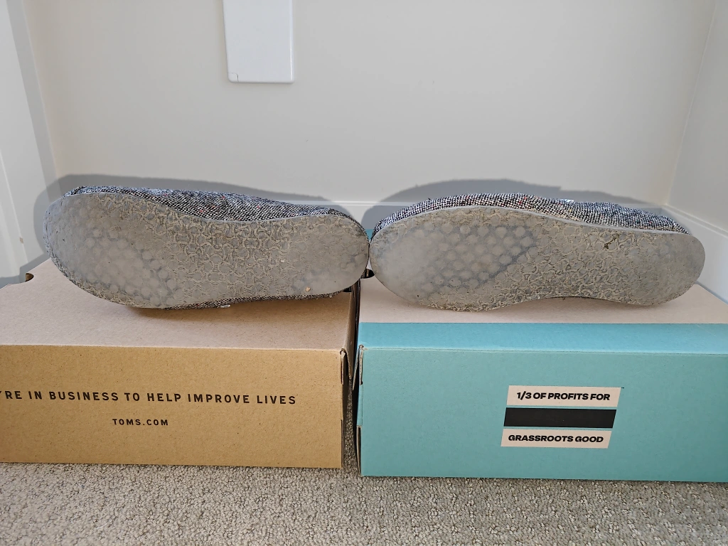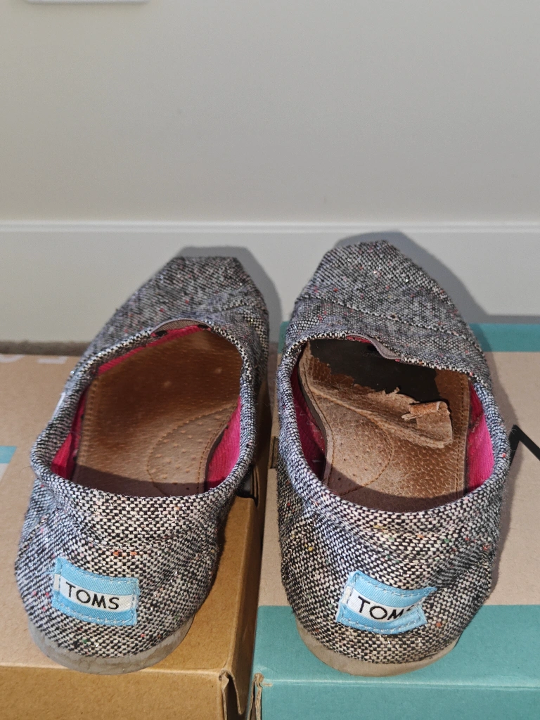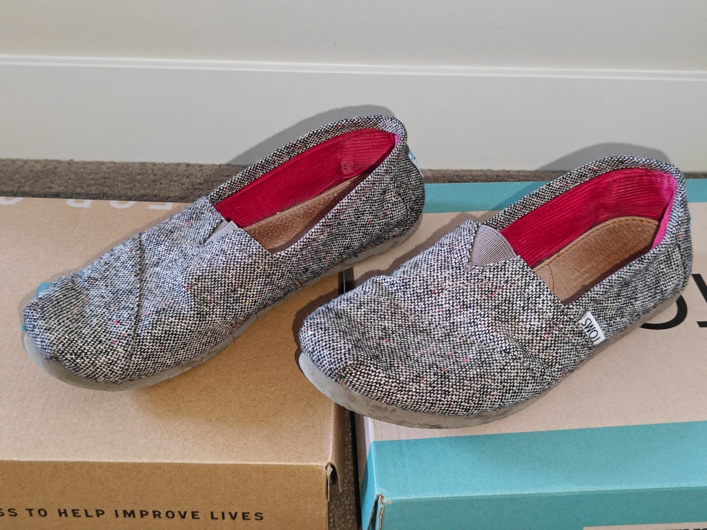 I am selling Women Tom's Slip-On Shoe - Classic Silver Karsen Sparkly Design in used, good condition. Colour is grey with faint silver sparkles. Twill textile outer. Elastic V on top for easy in and out. Red velvet inside. Lightweight and airy.