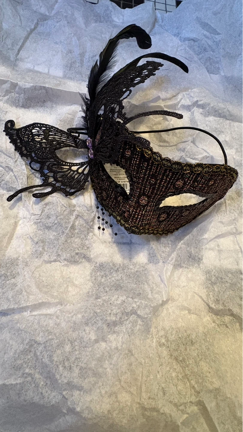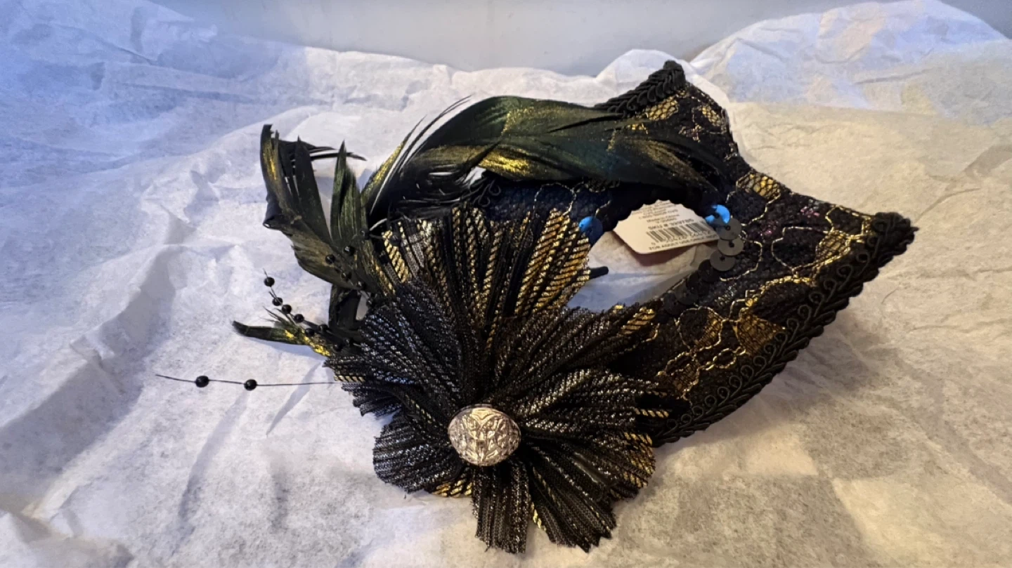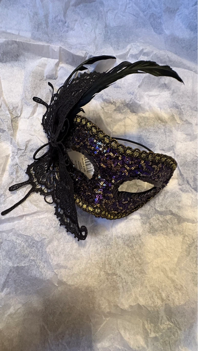 These decorative masquerade masks are embellished with feathers, sequins, and intricate lace details. They feature elastic straps for a secure fit. Available in various designs and colors. $4 each