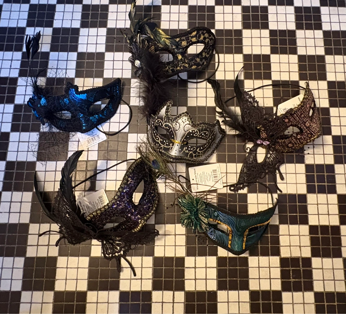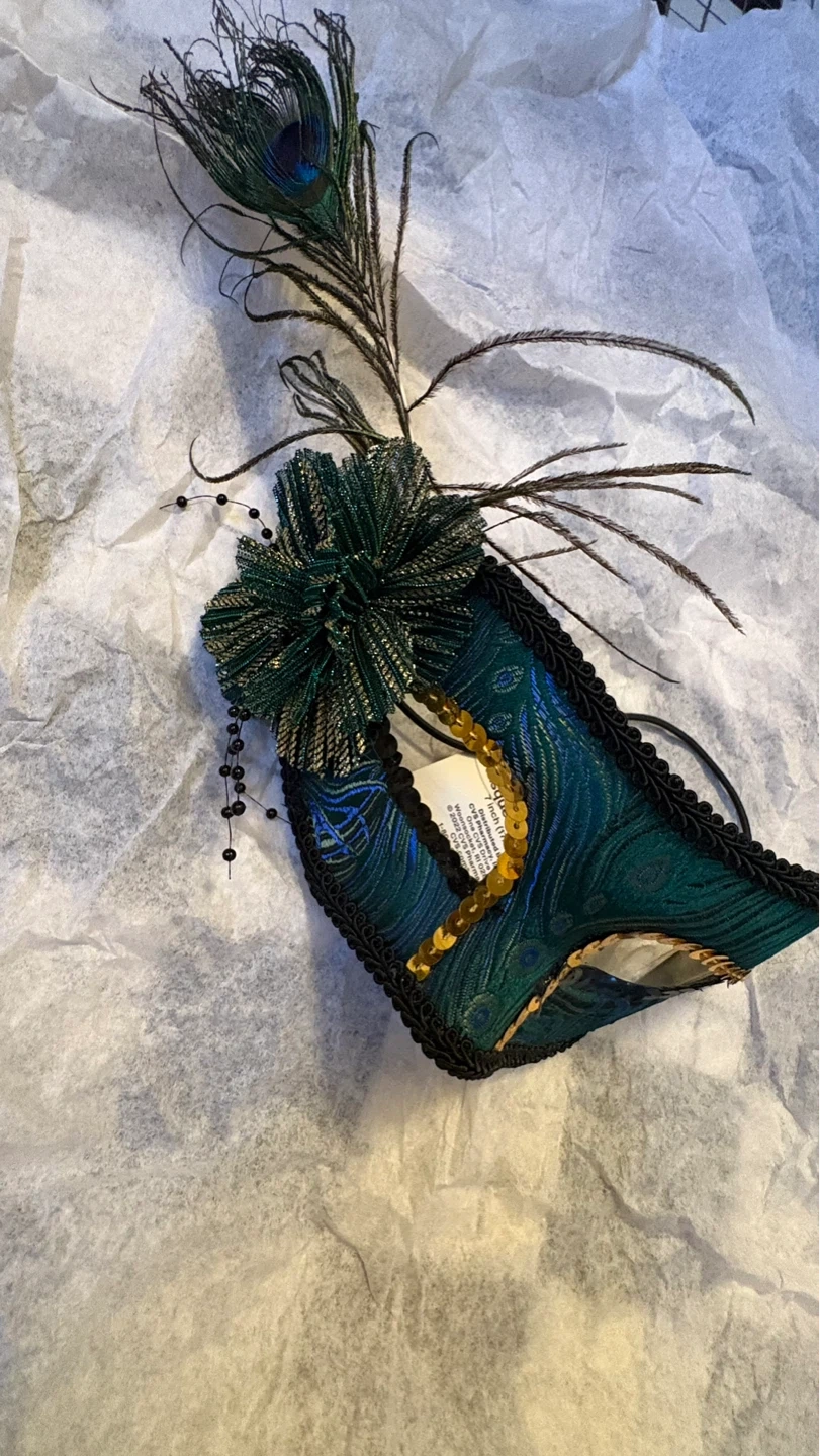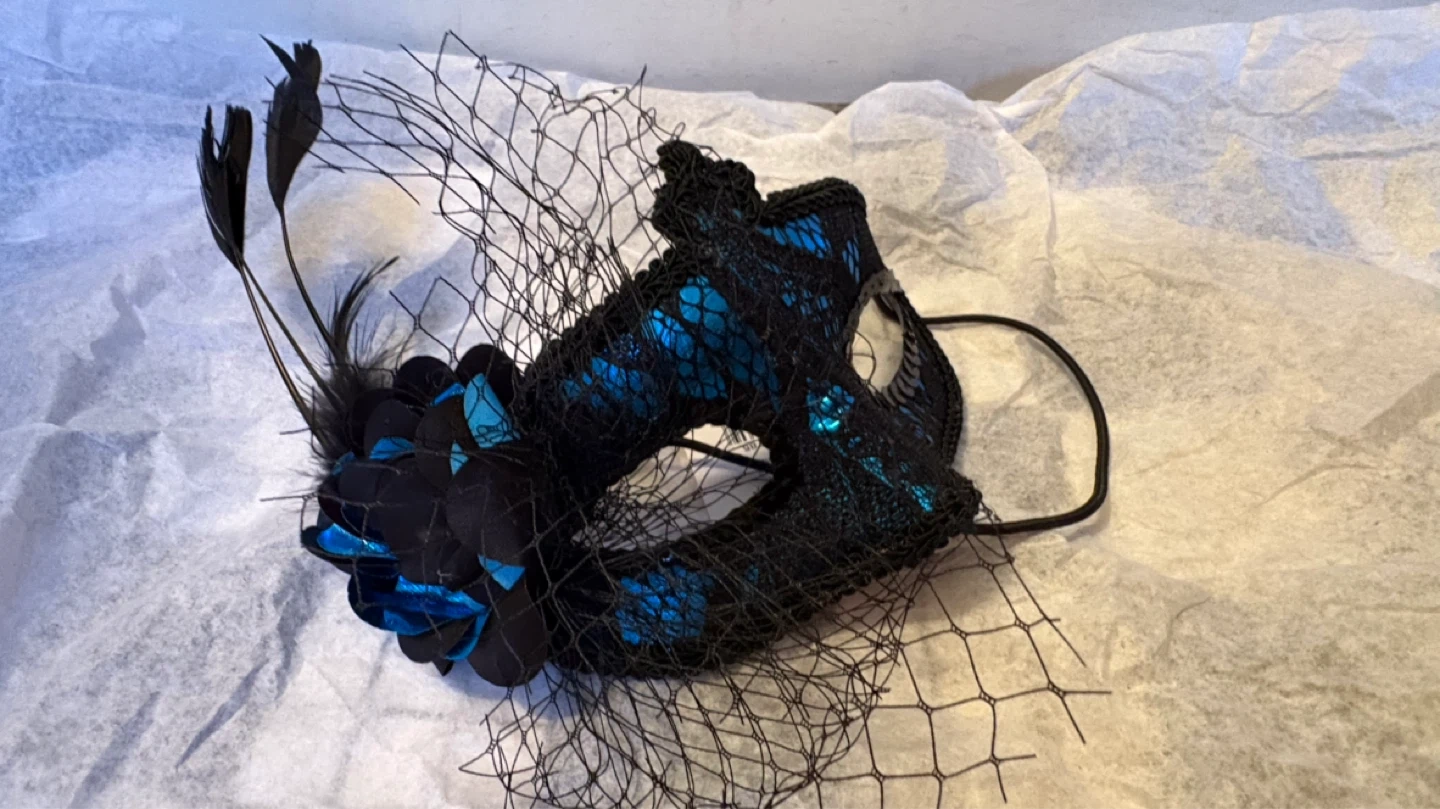 These decorative masquerade masks are embellished with feathers, sequins, and intricate lace details. They feature elastic straps for a secure fit. Available in various designs and colors. $4 each