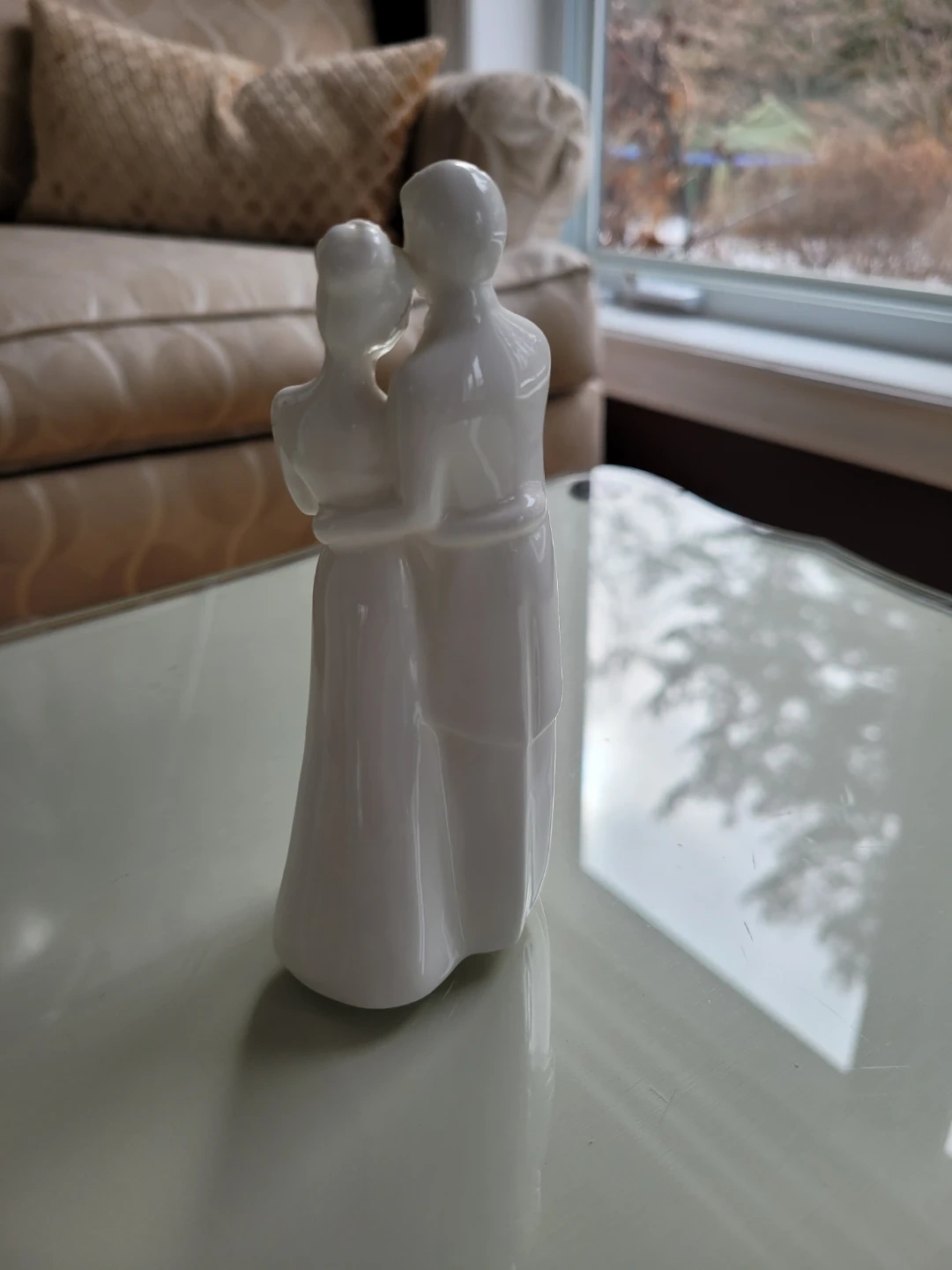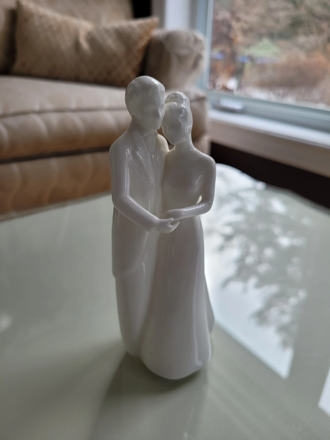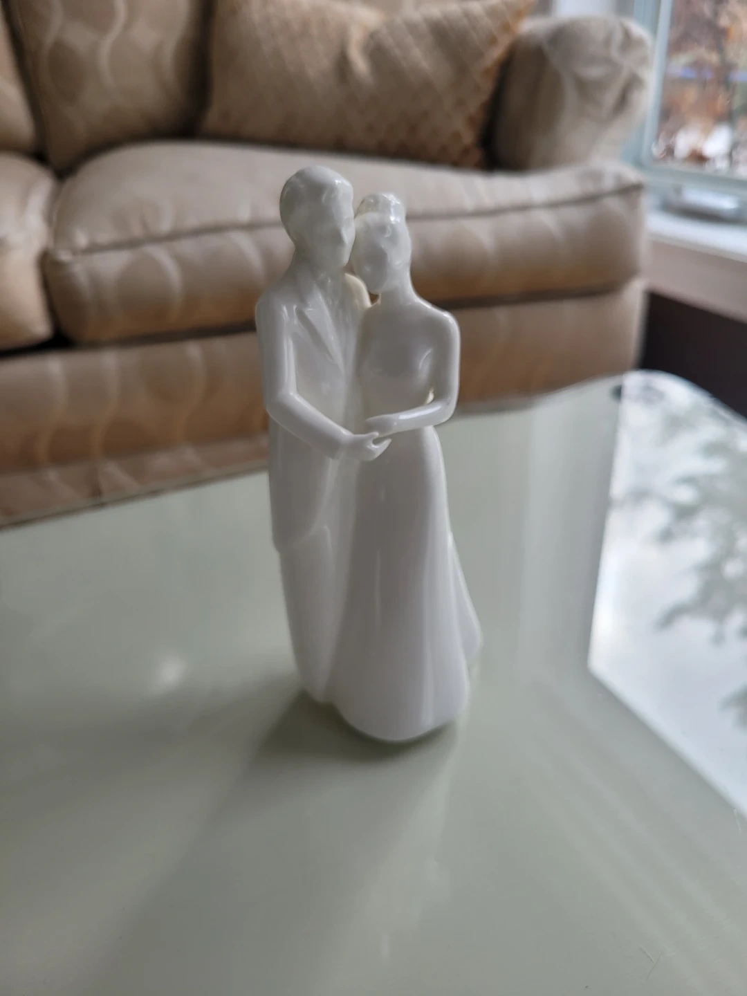 A sweet white porcelain figurine by Coalport featuring a bride and groom embracing. Titled Our Special Day It's a classic keepsake for any wedding celebration. This elegant piece is perfect as a gift to bride from significant other or a cake topper or just a decorative accent.