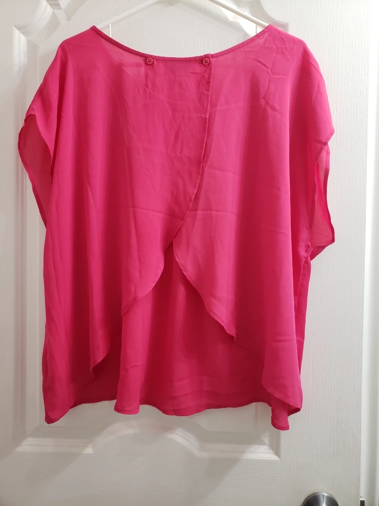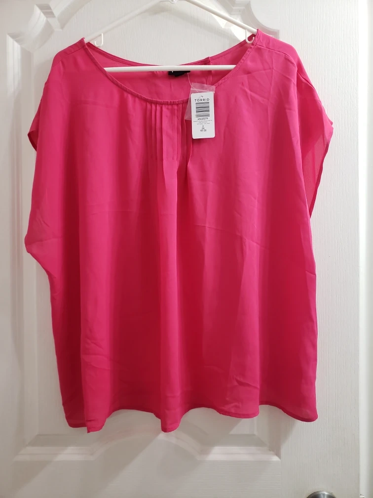 This Torrid sleeveless crop top is made of georgette fabric in a vibrant pink. It's a size 2X, fitting sizes 18-20. This top has a stylish dolman sleeve design with a lovely layered back detail, secured by two small buttons at the neck.