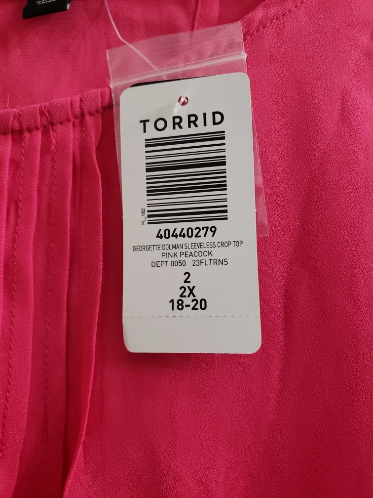 This Torrid sleeveless crop top is made of georgette fabric in a vibrant pink. It's a size 2X, fitting sizes 18-20. This top has a stylish dolman sleeve design with a lovely layered back detail, secured by two small buttons at the neck.