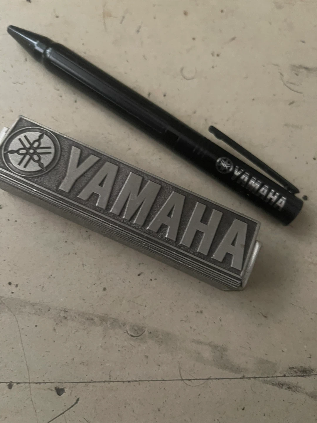 This set includes a black Yamaha branded pen and a silver metal Yamaha emblem. The pen features a clip and subtle branding. The emblem has a detailed, embossed Yamaha logo.