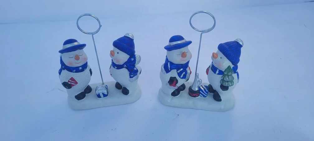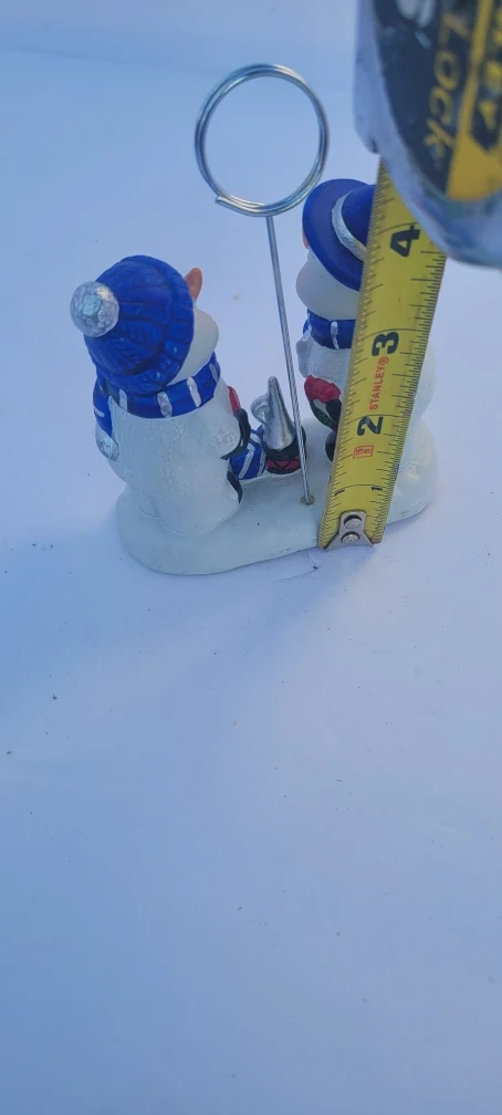 This is a cute snowman figurine that can be used as table decor. It has a metal wire extending from the base that can be used to hold a picture or table card. It is approximately 3 inches tall.