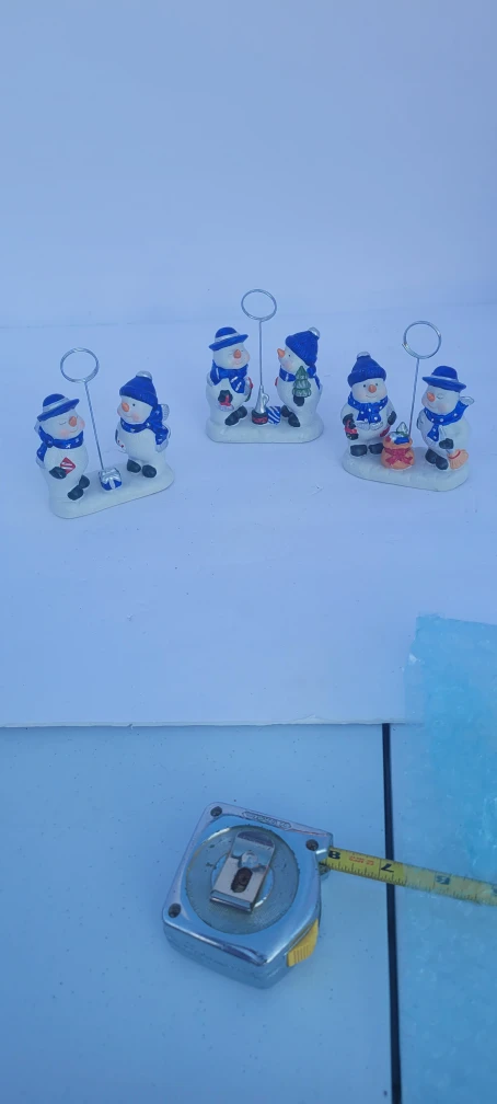 This is a cute snowman figurine that can be used as table decor. It has a metal wire extending from the base that can be used to hold a picture or table card. It is approximately 3 inches tall.