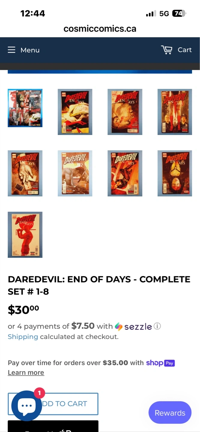 Buy & SellDaredevil: End of Days Comic Book Lot (6 Issues)Daredevil: End of Days Comic Book Lot (6 Issues)$3Five dollars each This is a lot of 6 Daredevil: End of Days comic books. All issues are from Marvel Comics. Some issues include digital copy offers.ConditionNewWHERE TO MEETCheck LocationView MapSELLERverifiedMustafaMarine Hamilton39038 reviews0 chats·1 favorites·6 viewsSEND CHAT TO SELLERHi Mustafa! I’m interested in your listing.Hi Mustafa! I’m interested in your listing.Get the Karrot app to chatSign In to chat
