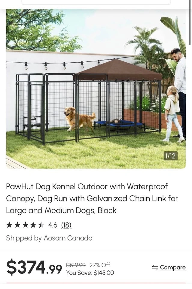 Brand new in box outdoor dog kennel with waterproof canopy. Features a galvanized chain link dog run, suitable for large and medium dogs. Black color.
