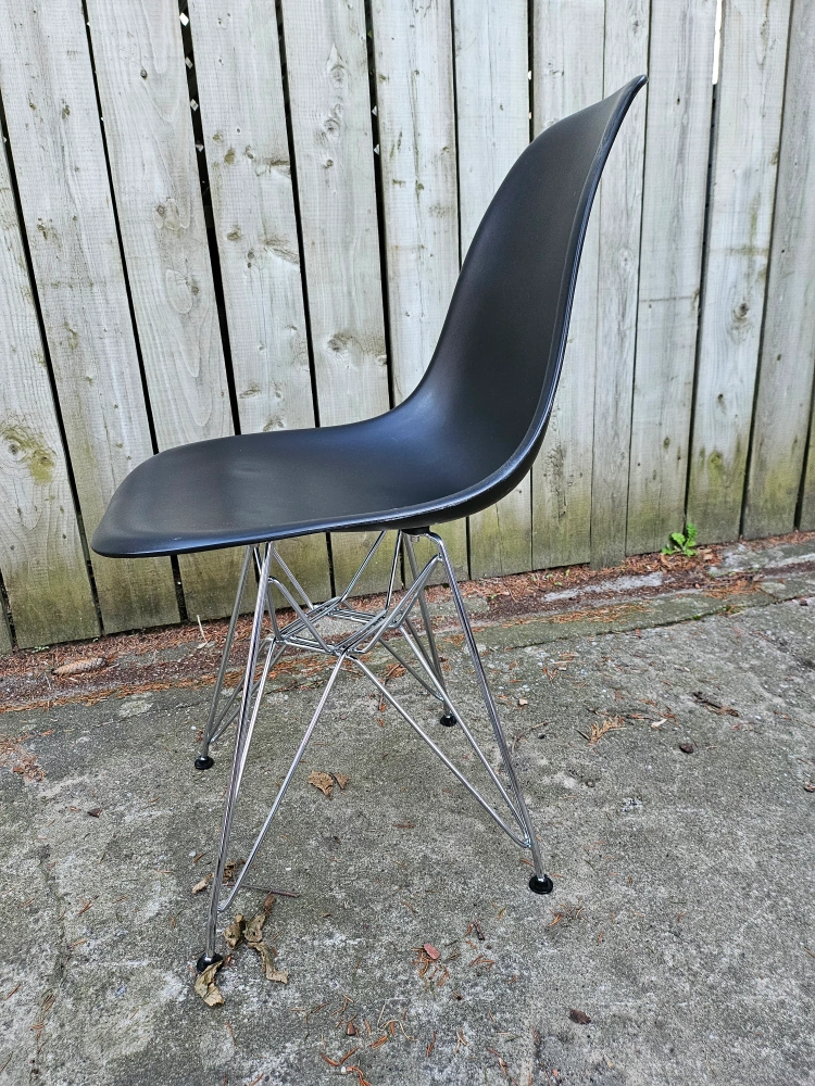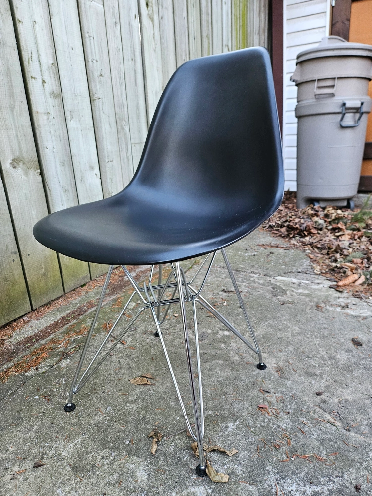 four matching modern chairs, black plastic with metal geometric legs. Perfect for use in an office or dining setting.