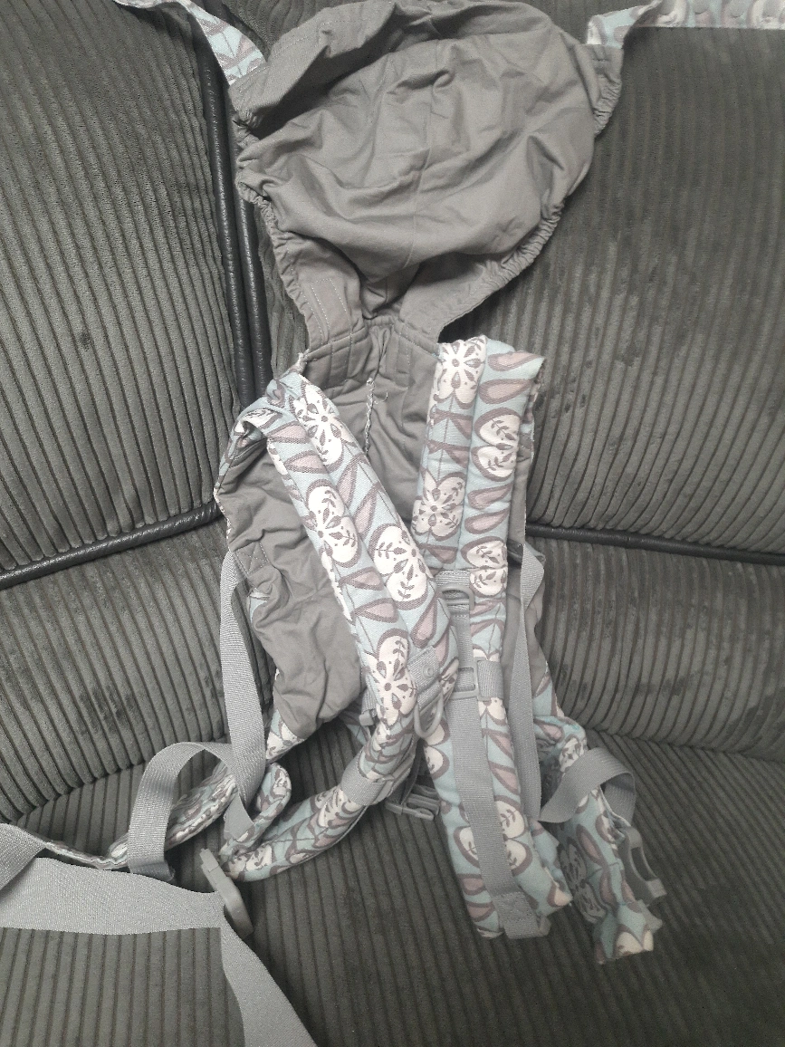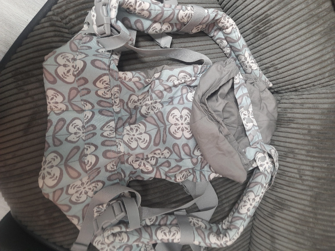 Here's an Ergobaby baby carrier! It features a lovely floral design and is in great condition. Perfect for keeping your little one close and comfortable while you're on the go. It's grey with a floral pattern.