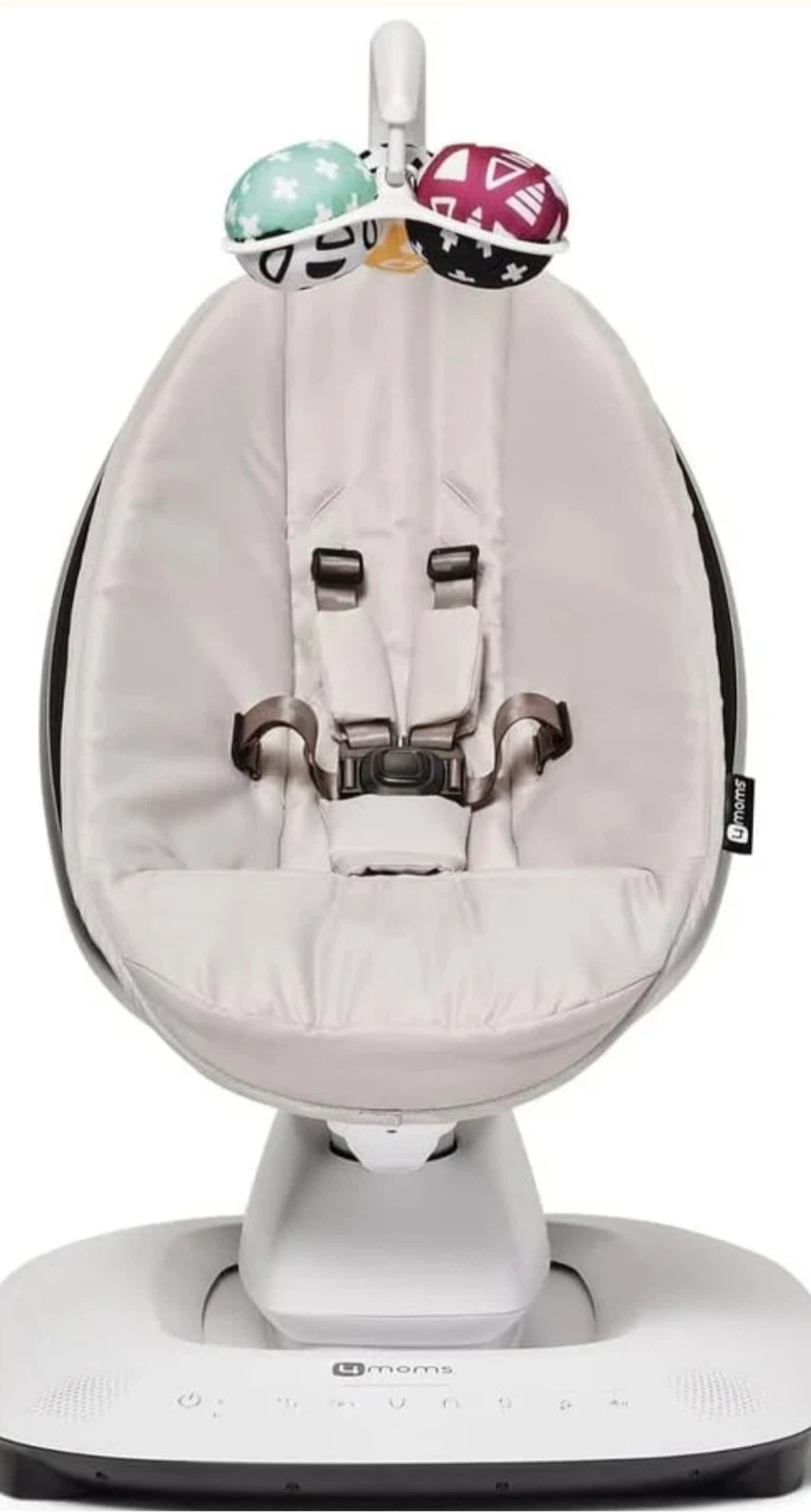 This 4moms MamaRoo baby swing offers five unique motions and four built-in sounds. It features a supportive seat with machine-washable fabric and a 3-to-5 point convertible harness. The recline is adjustable, and interactive toys are included. It's designed to entertain and soothe your baby.
