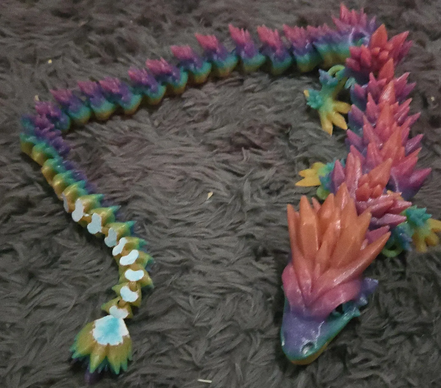 A colourful articulated dragon toy with a crystal-like texture. It features segments that can be moved and posed. Great for fidgeting!