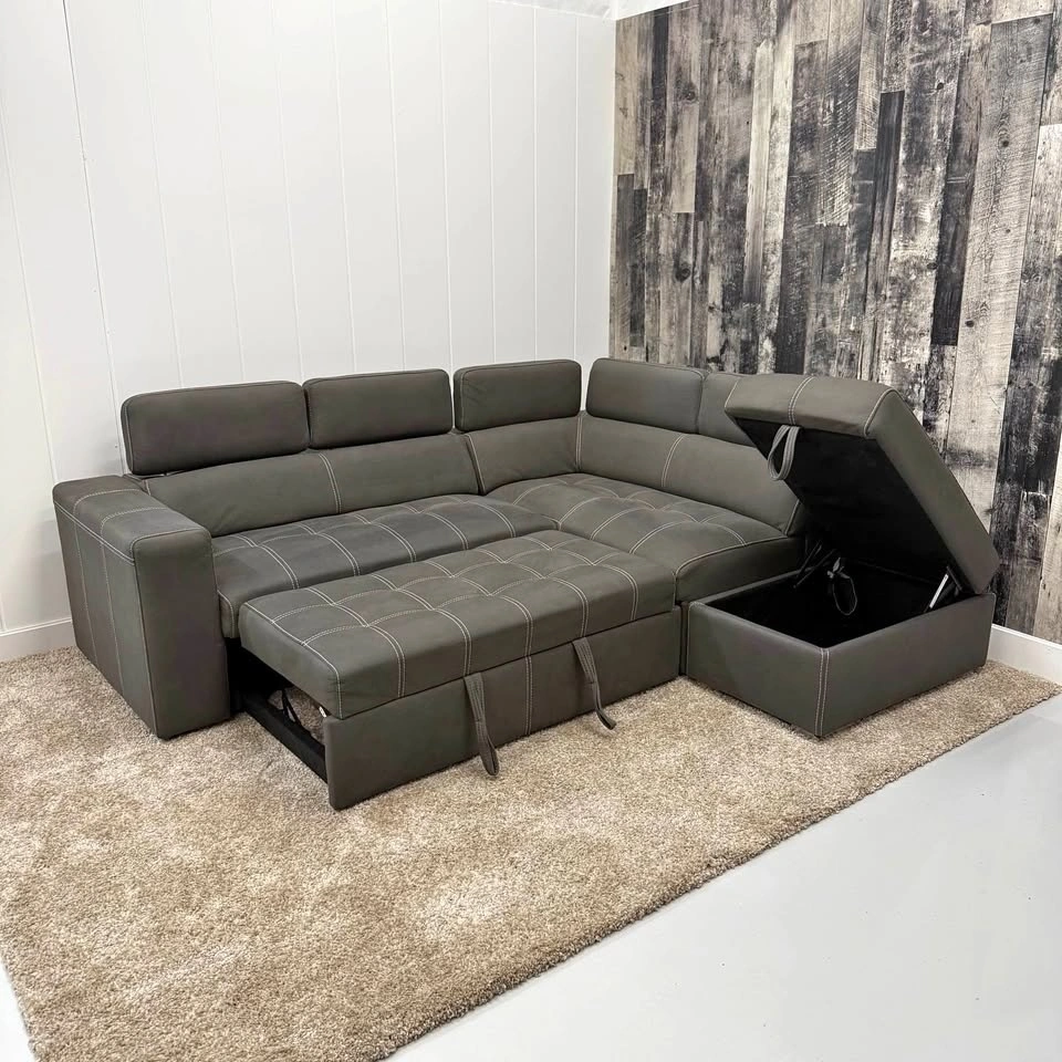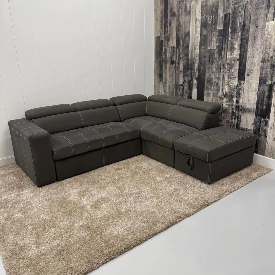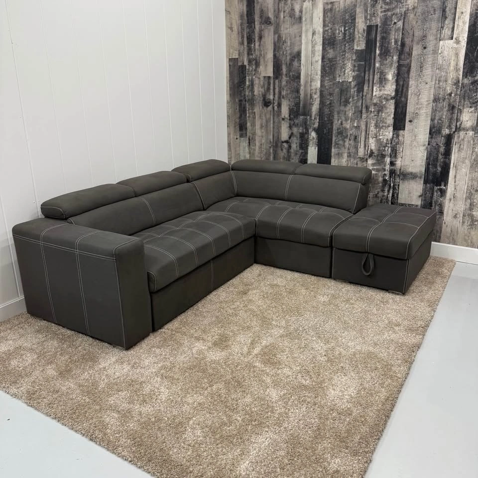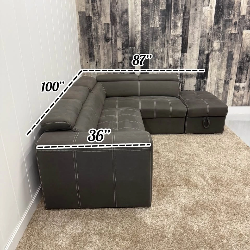 Drake sectional with integrated pullout sleeper. Storage ottoman included. Flip-up adjustable headrests. Clean modern design with contrast stitching. Multi-function layout — seating, storage, and bed in one. Professionally steam cleaned with fabric shampoo and enzyme treatment. This sofa has been well cared for in a non-smoking home with no stains, rips, or tears.
