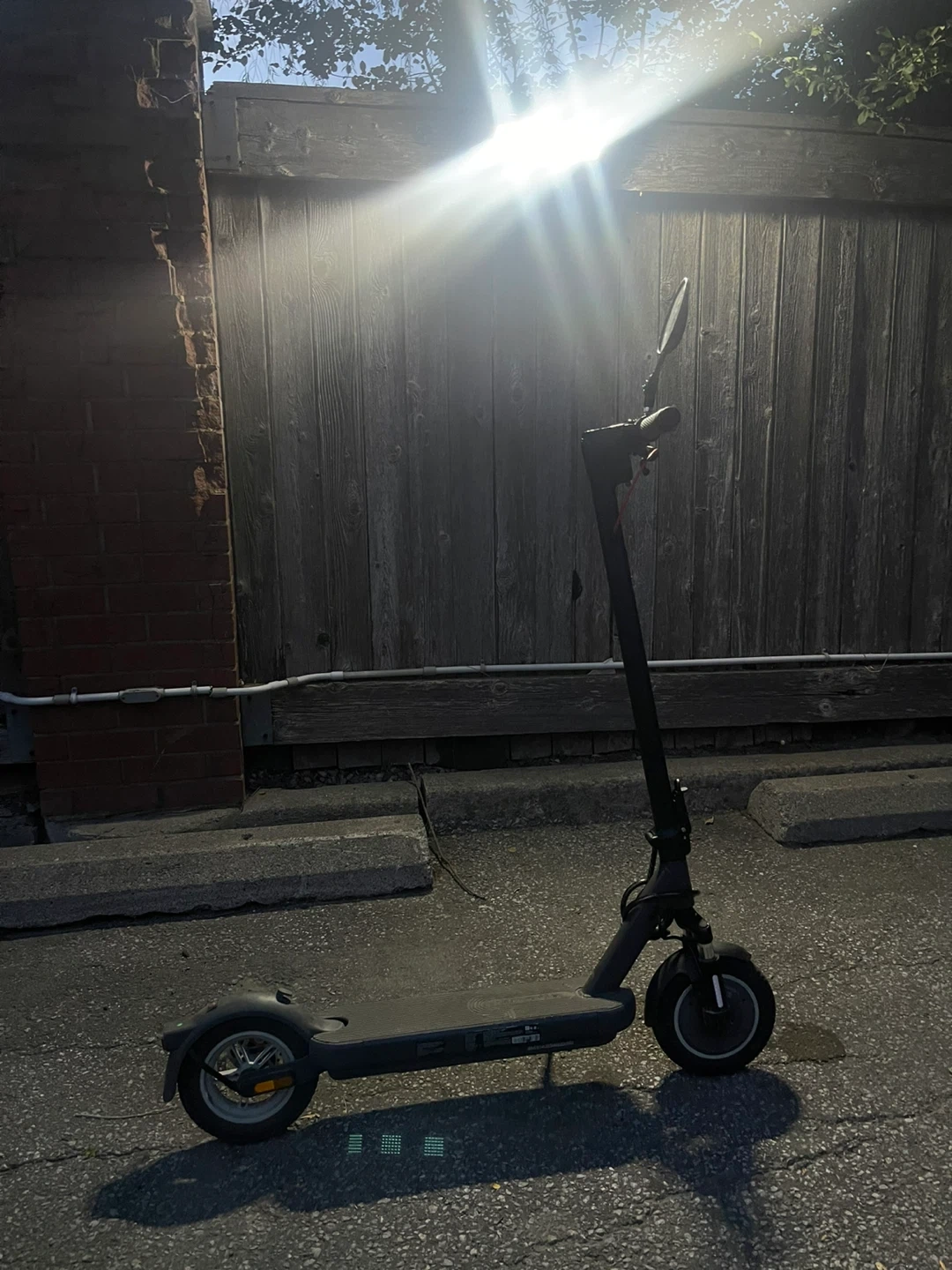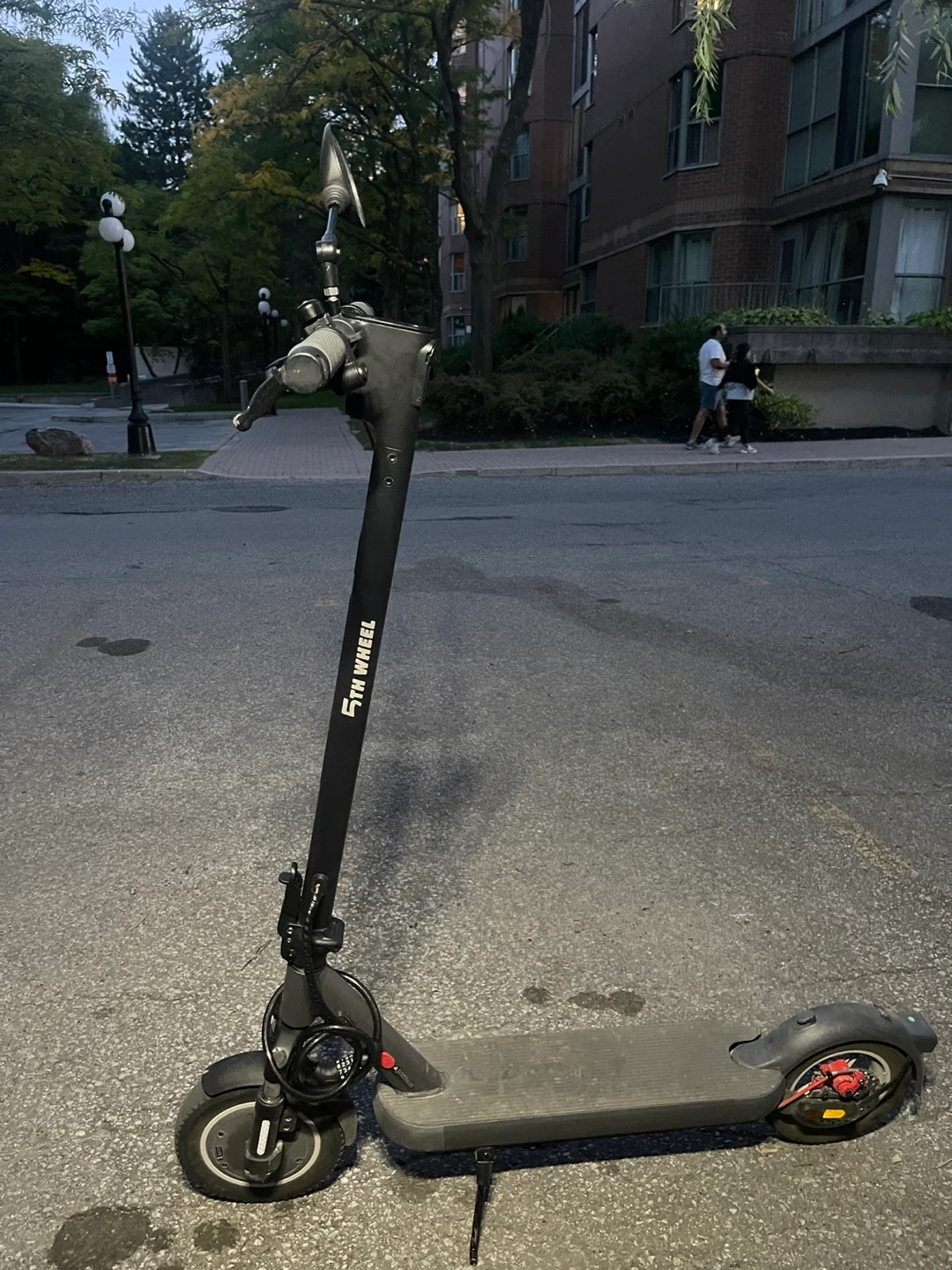 A black 5th Wheel electric scooter with a digital display. It features a foldable design for easy storage and transport. Includes a built-in headlight and taillight for visibility.