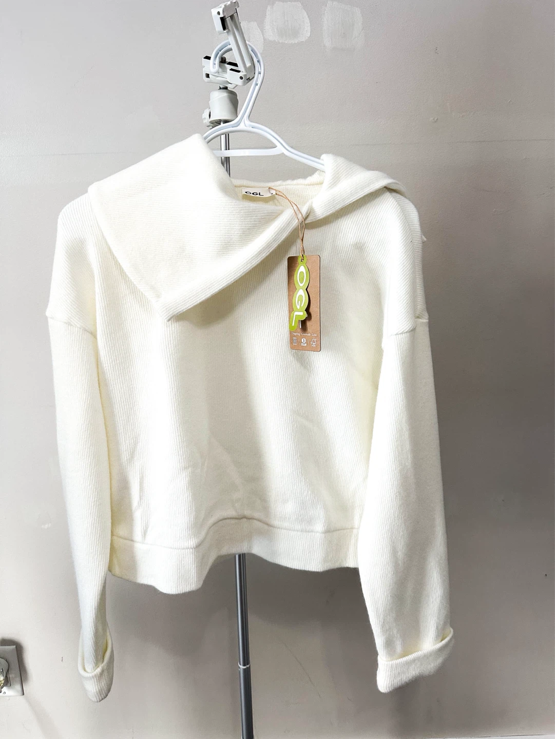 Cream coloured ribbed sweatshirt with a wide collar. Made with 95% organic cotton and 5% spandex. Great for layering this fall!