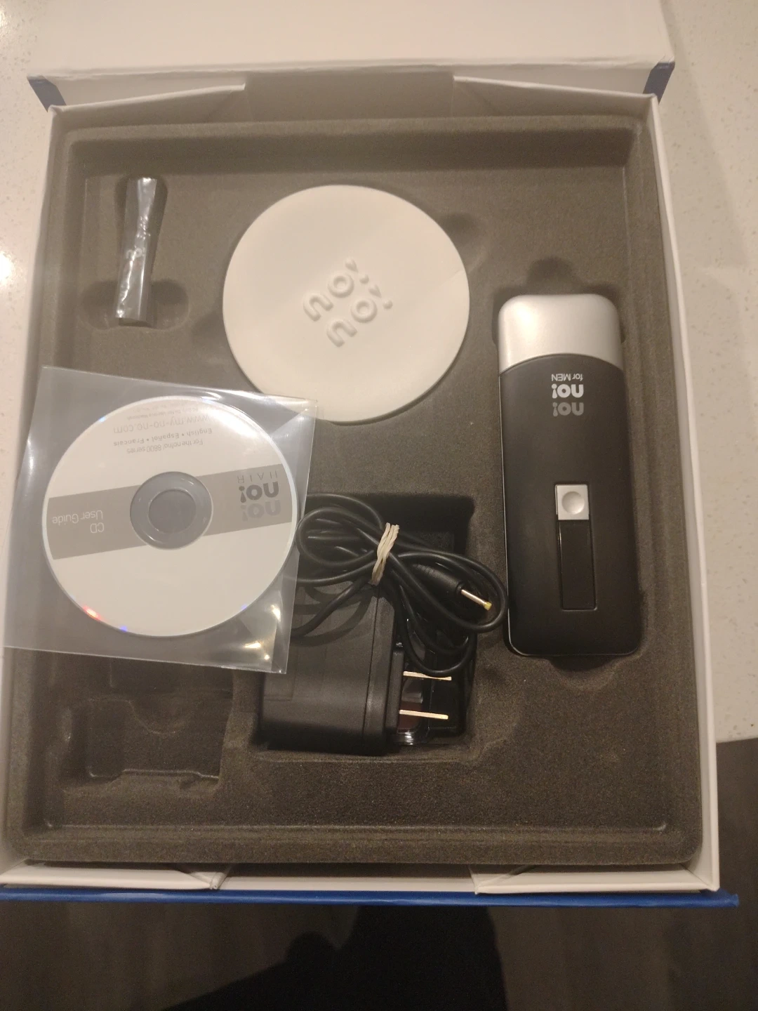 This is a no!no! hair removal device designed for men. It comes with a charging cord, user guide CD, and an accessory tool. The packaging also includes a cleaning disc. Each photo is 15$
