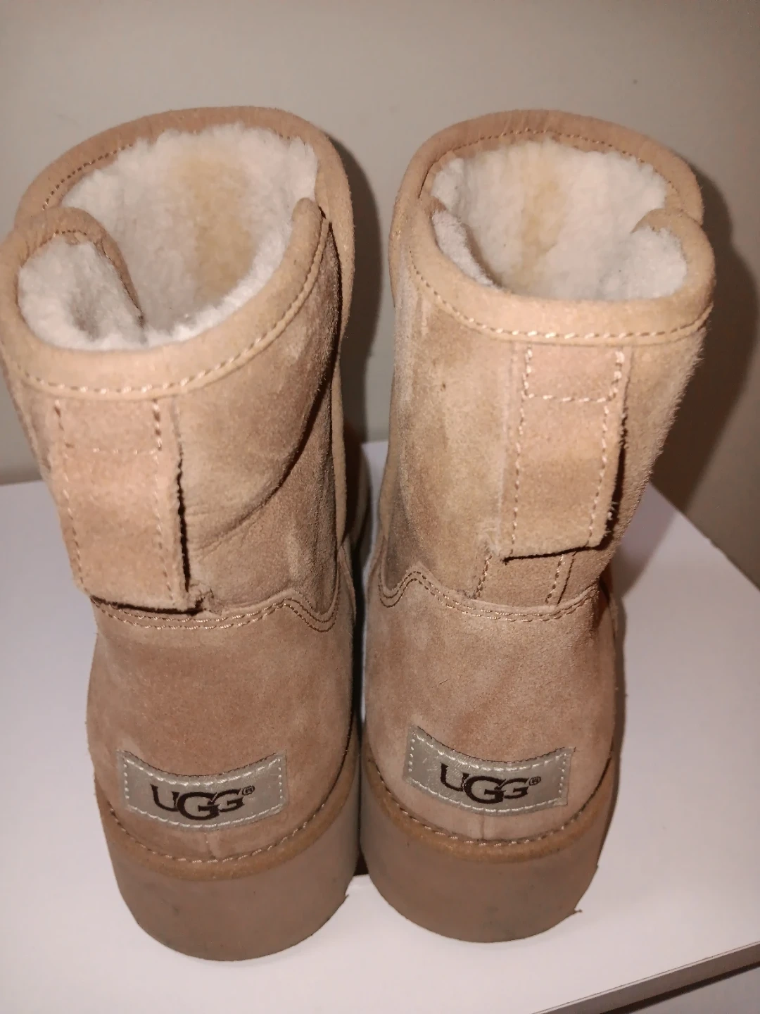 These UGG Classic Mini boots are made from tan suede with a cozy sheepskin lining. Used 4 times indoors only 9/10