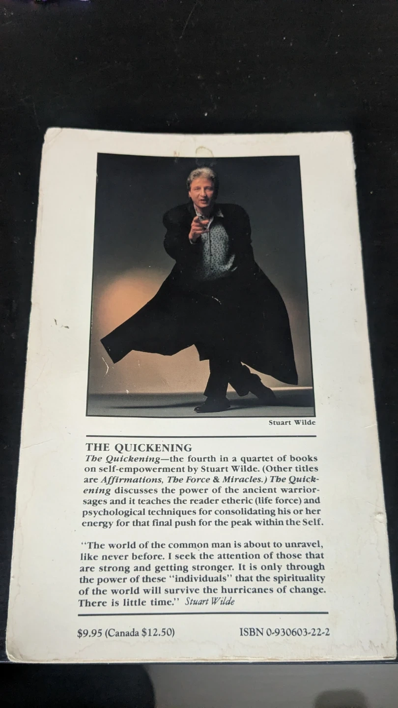 "The Quickening" by Stuart Wilde, the fourth in a quartet of books on self-empowerment. It discusses the power of the ancient warrior sages and teaches the reader etherical (life force) and psychological techniques for consolidating his or her energy for that final push for the peak within the Self.