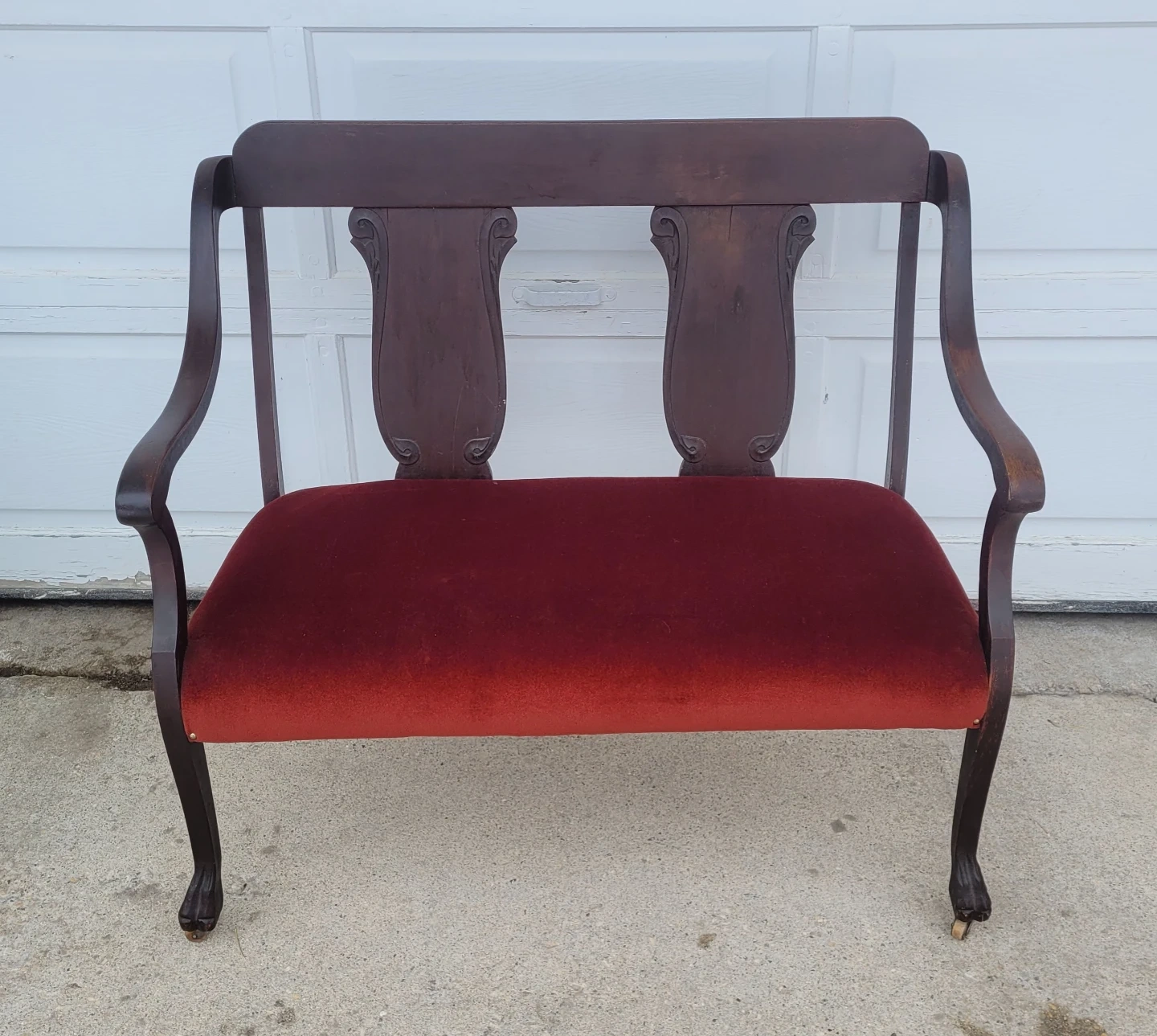 Beautiful Upholstered Bench with red velvet seat on small wooden wheels. Rolls quite nicely. In good condition.