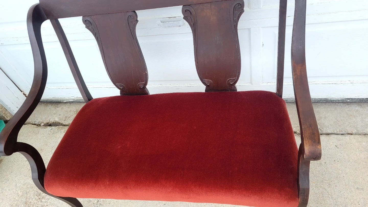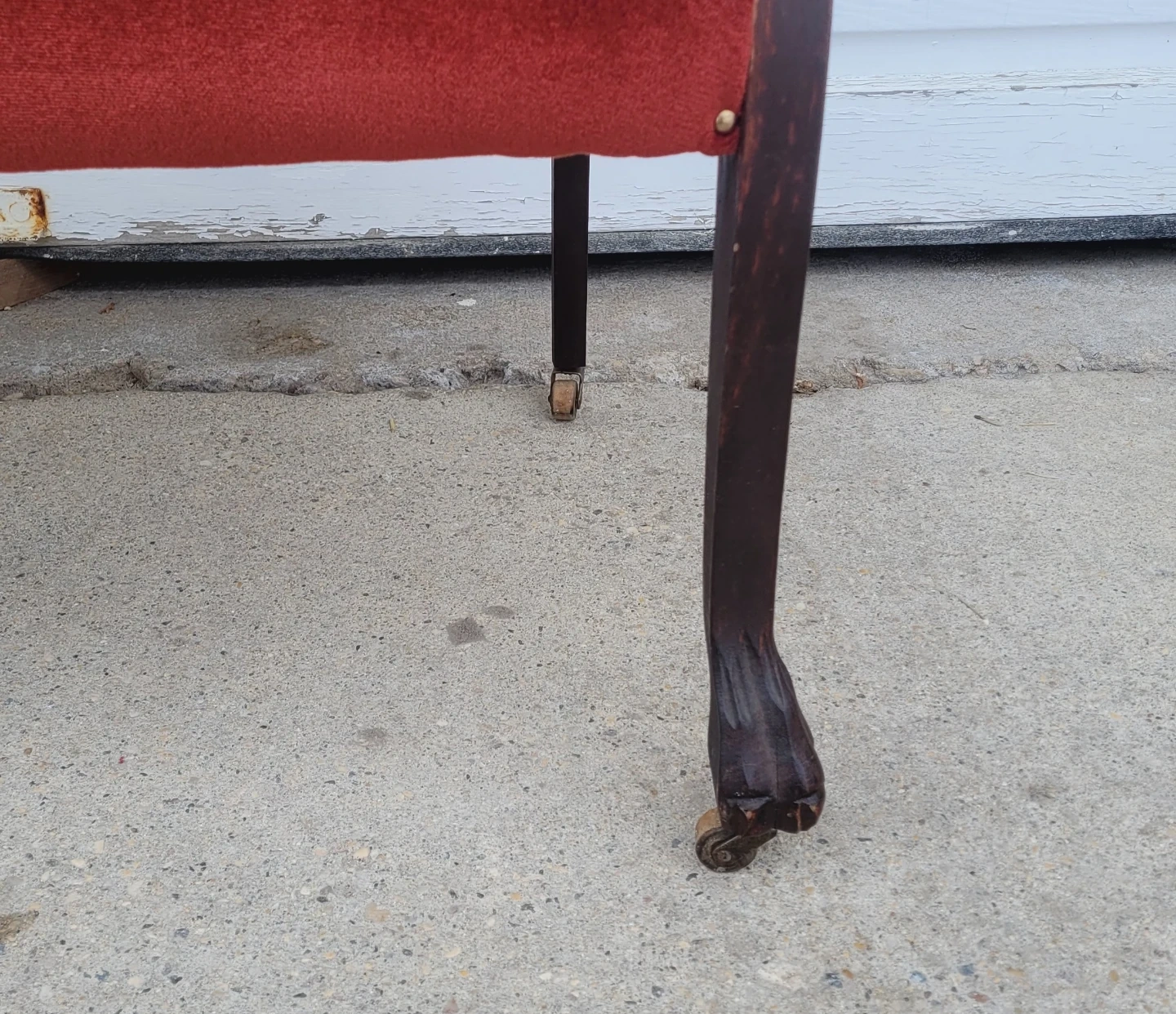 Beautiful Upholstered Bench with red velvet seat on small wooden wheels. Rolls quite nicely. In good condition.