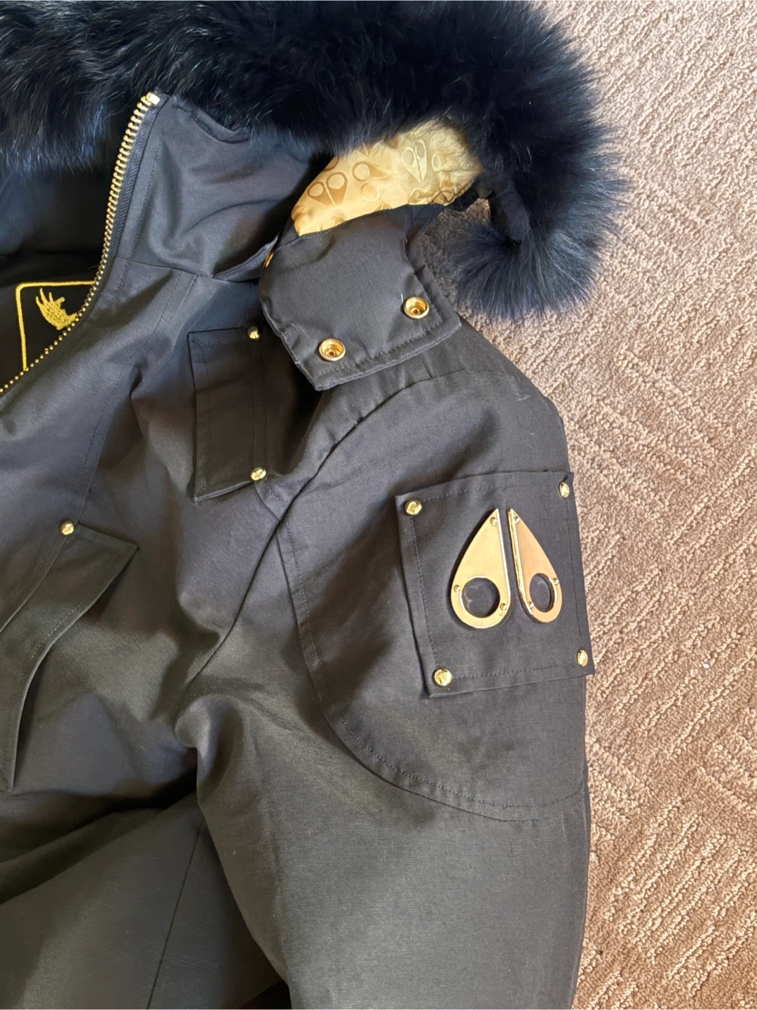 Down filled Moose Knuckles jacket with a black exterior and gold lining. Features the brand's signature logo on the sleeve. Perfect for staying warm during colder months!