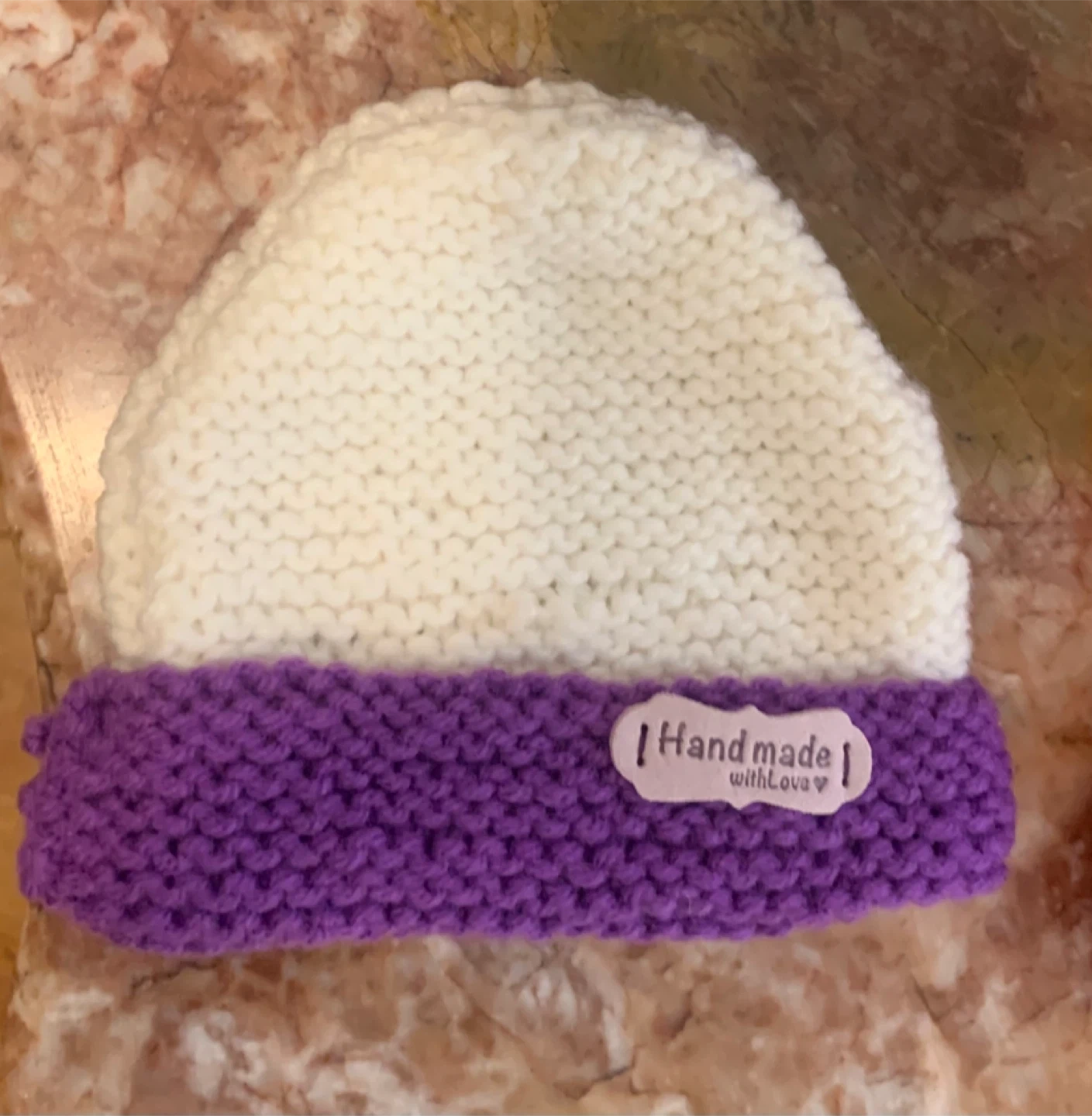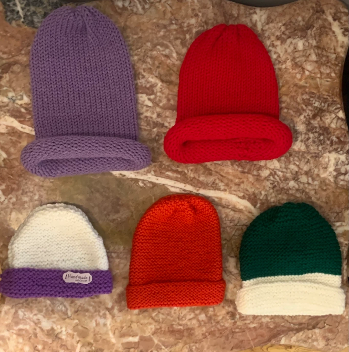 I'm selling these adorable handmade knitted baby beanies! They come in a variety of colours, including white/purple, red, purple, green/white, and red. Perfect for keeping your little one warm and cozy!