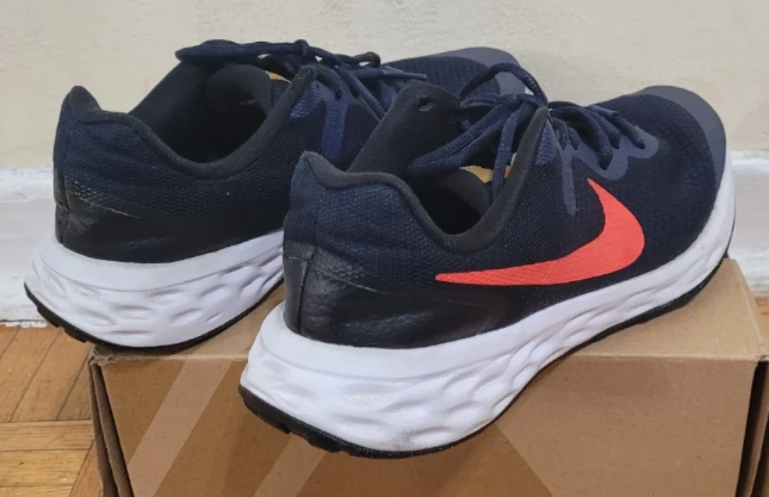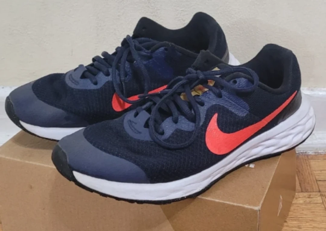 Kids' Nike Revolution 6 NN running shoes in navy blue and red. US Youth size 6, UK 5.5, EUR 38.5, CM 24. These shoes are made for active kids. They're lightweight and comfortable for everyday wear or sports. Price Negotiable.