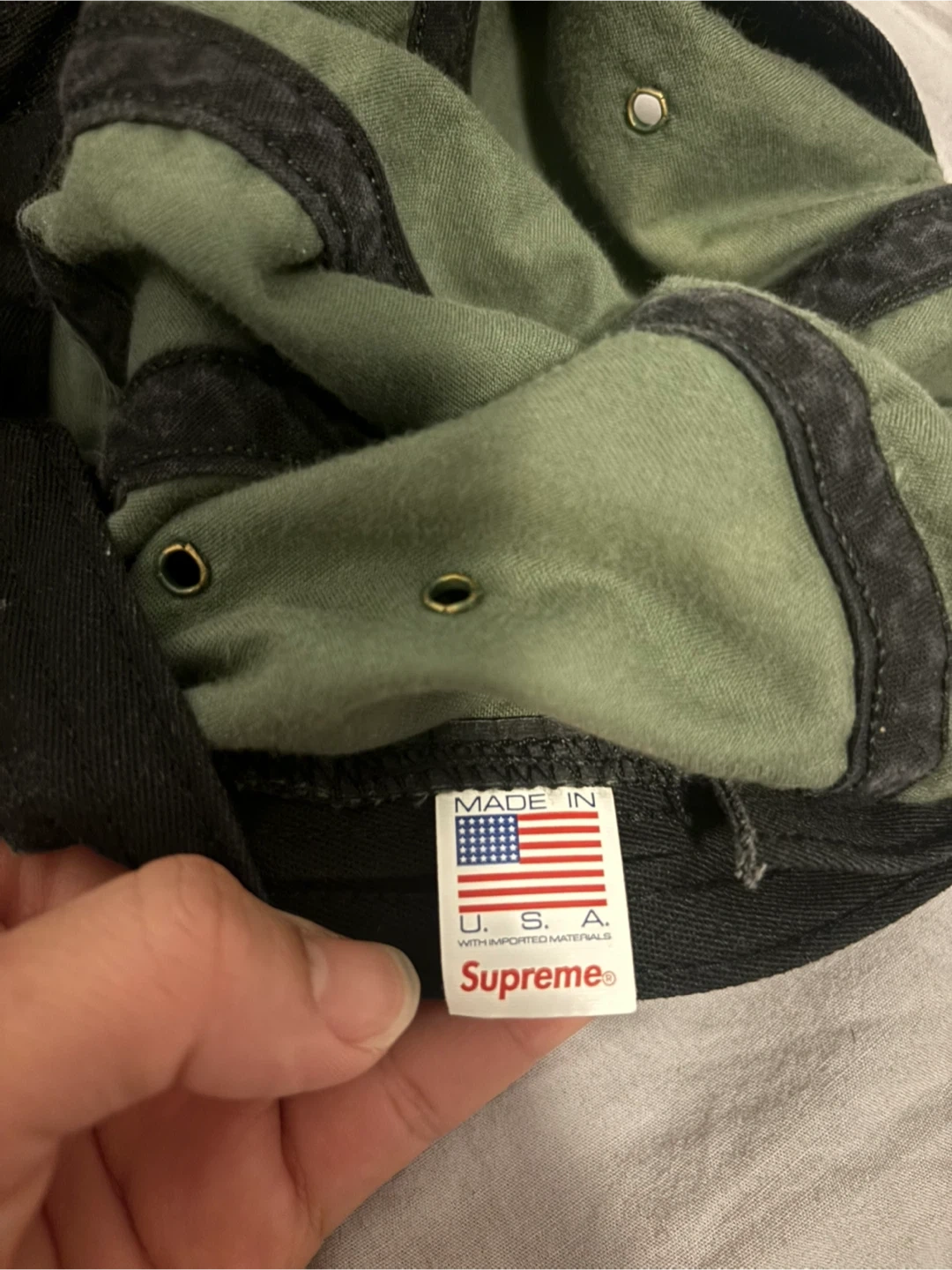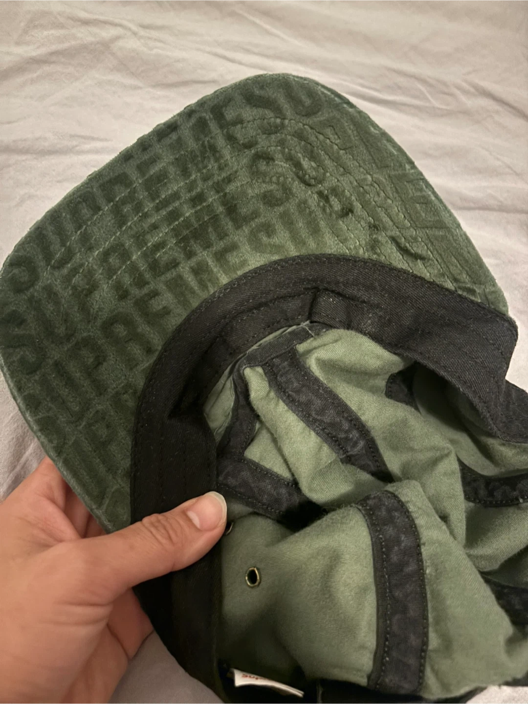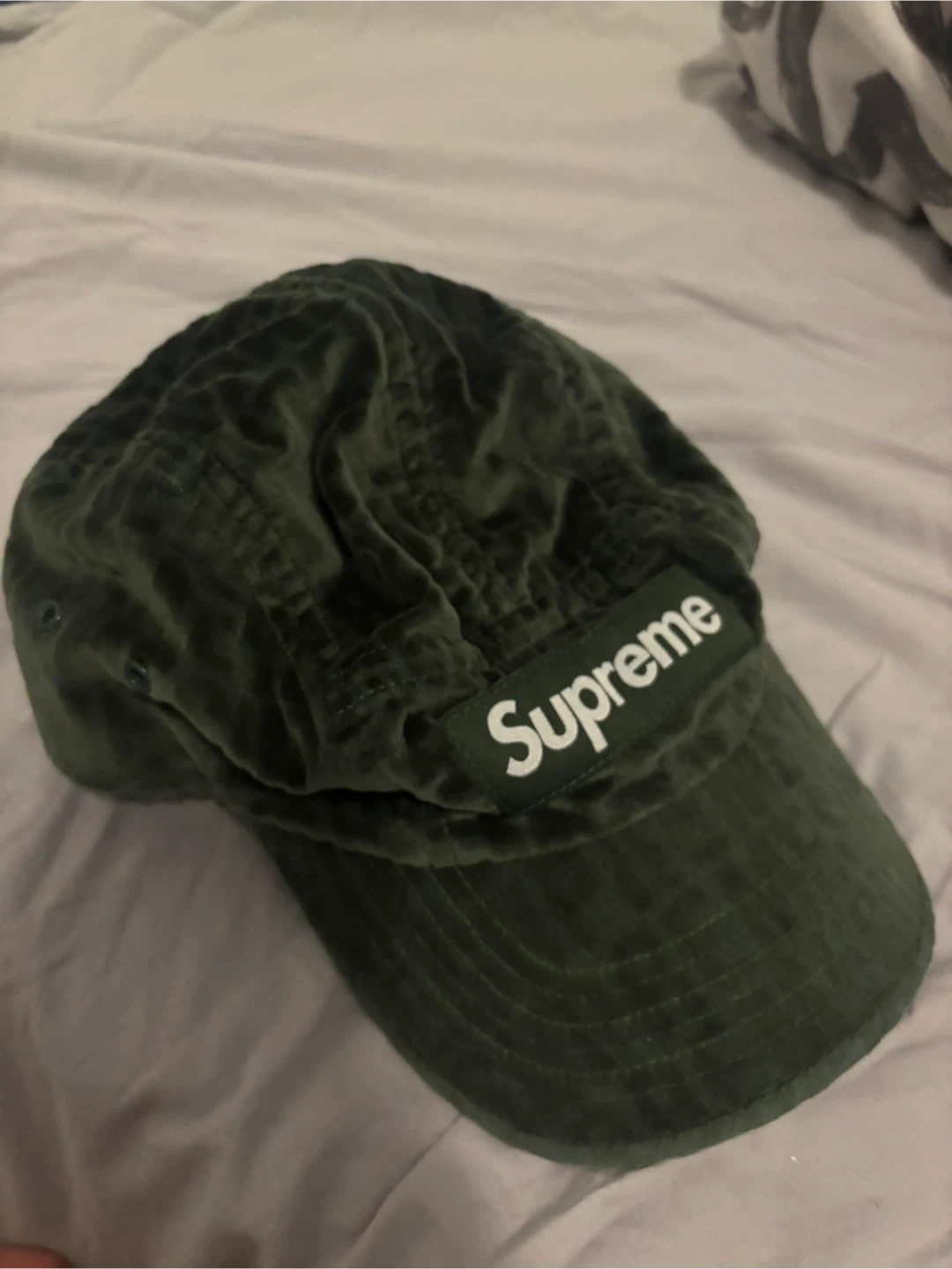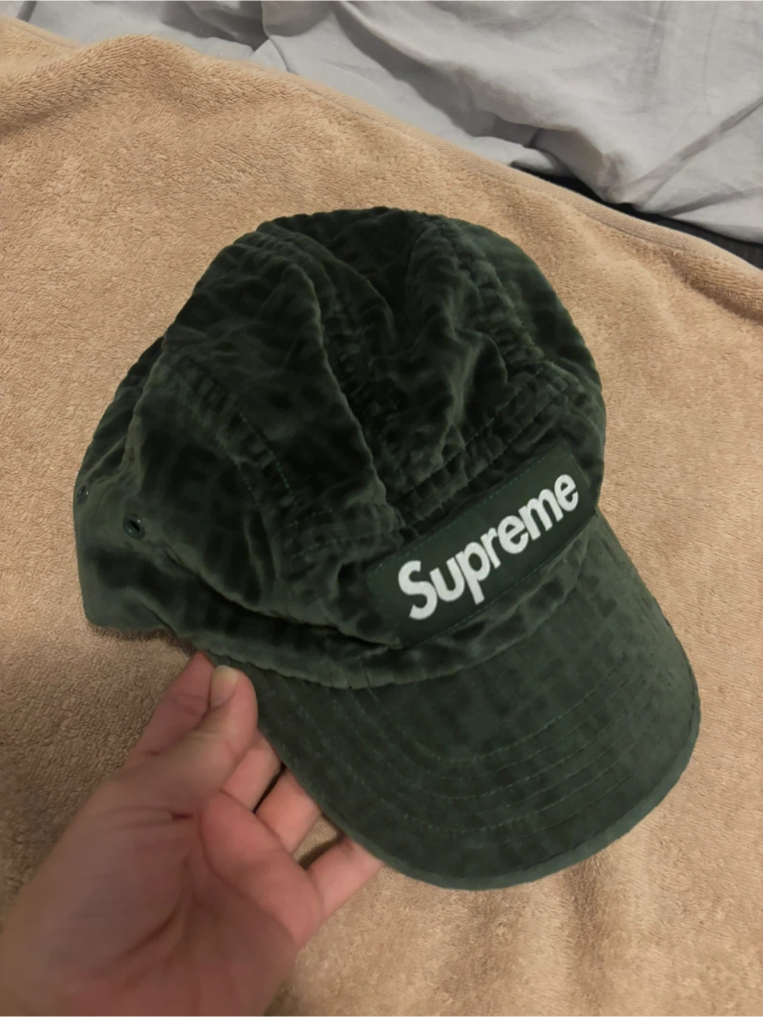 This is a green Supreme velour 5-panel cap. It's made in the U.S.A. with imported materials. The cap has a distinct all-over embossed Supreme logo pattern. It's a stylish accessory for any streetwear enthusiast!