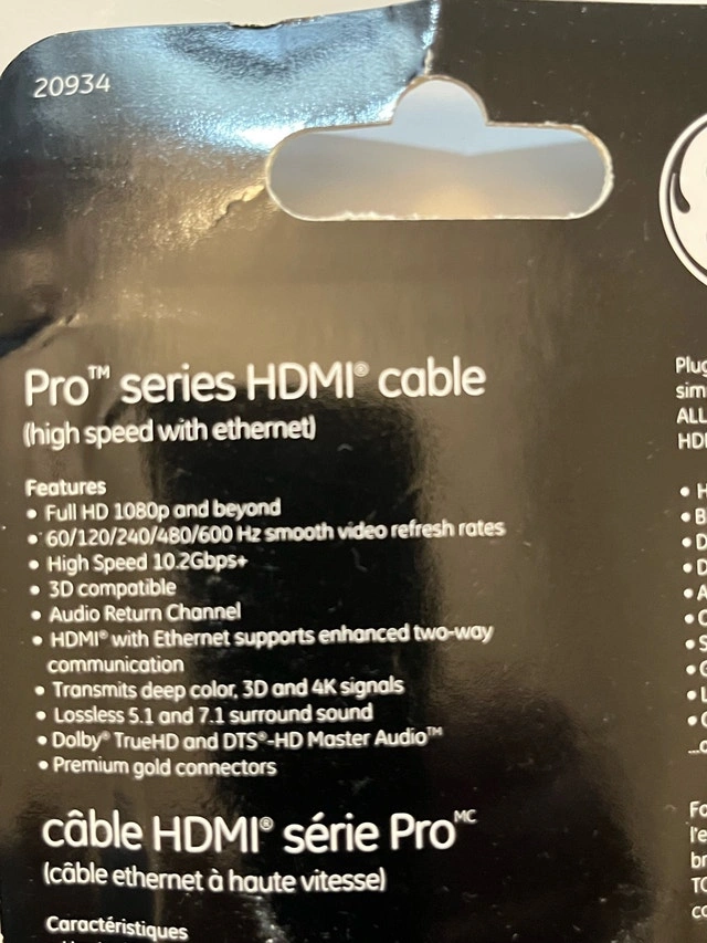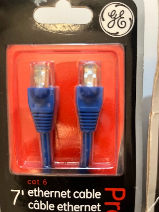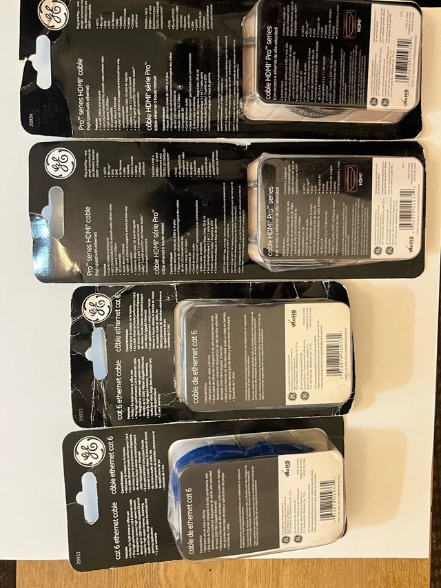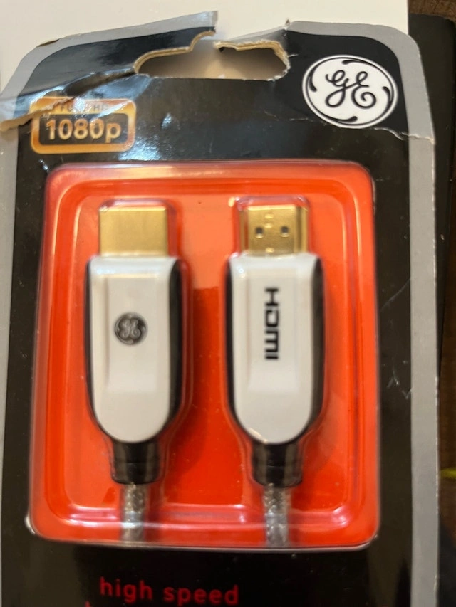 I have a selection of unopened GE cables available for sale at just $2 each! These are new and unopened, though the packaging looks a bit rough. GE Pro 3' HDMI Cables with Ethernet: Experience full HD 1080p and beyond with high-speed capabilities and premium gold connectors. Ideal for streaming and gaming applications. GE Cat 6 Ethernet Cables: Perfect for home or office use, these cables support up to 1000 MB/sec (Gigabit Ethernet) for fast and reliable network connections. If the ad's still up, the cables are still up for grabs! Each cable is priced at $2.