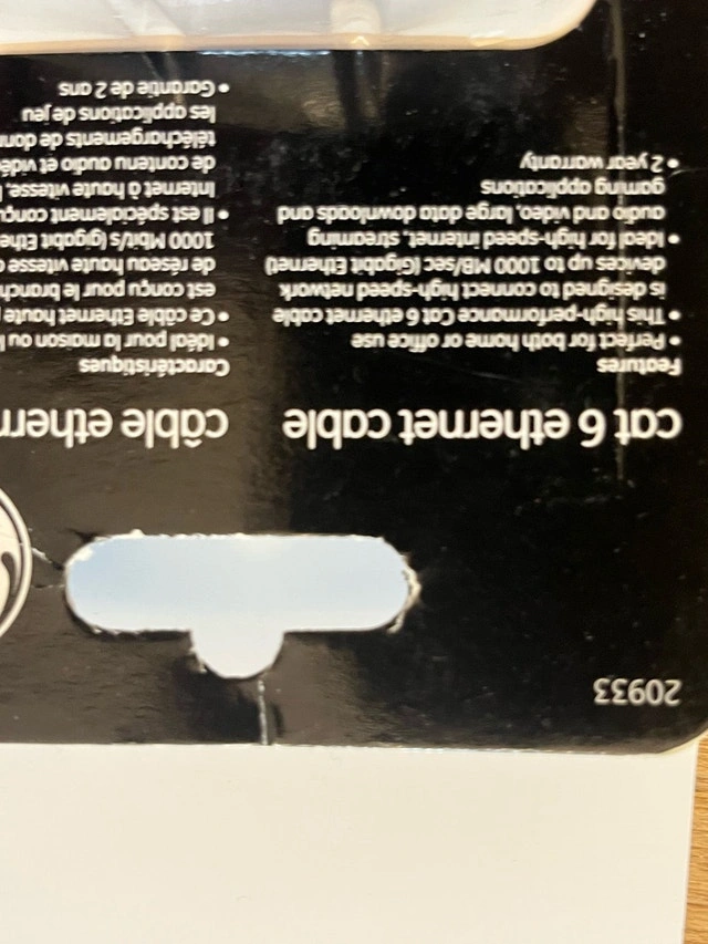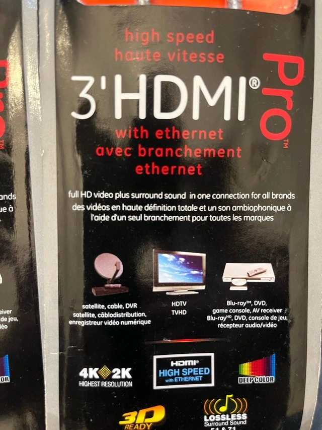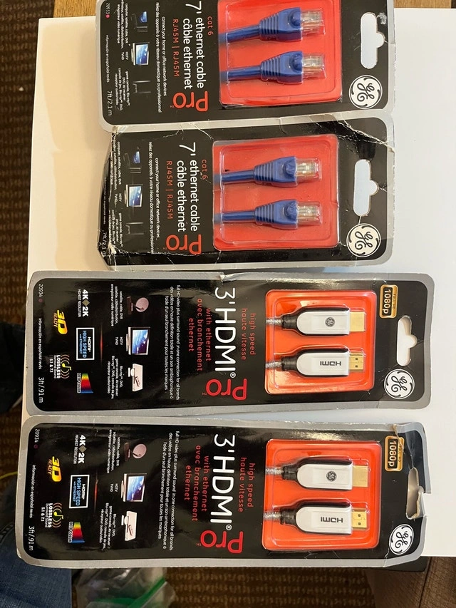 I have a selection of unopened GE cables available for sale at just $2 each! These are new and unopened, though the packaging looks a bit rough. GE Pro 3' HDMI Cables with Ethernet: Experience full HD 1080p and beyond with high-speed capabilities and premium gold connectors. Ideal for streaming and gaming applications. GE Cat 6 Ethernet Cables: Perfect for home or office use, these cables support up to 1000 MB/sec (Gigabit Ethernet) for fast and reliable network connections. If the ad's still up, the cables are still up for grabs! Each cable is priced at $2.