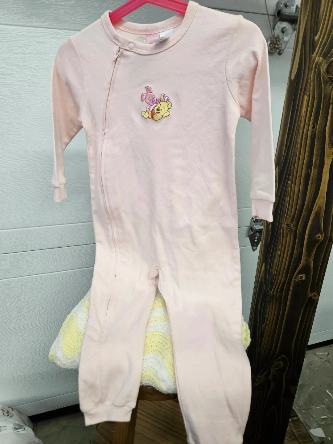Pink Disney baby pajamas featuring Winnie the Pooh. It's a size 24 months and made of 100% cotton. These are perfect for cozy nights!