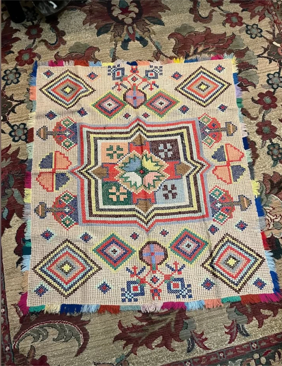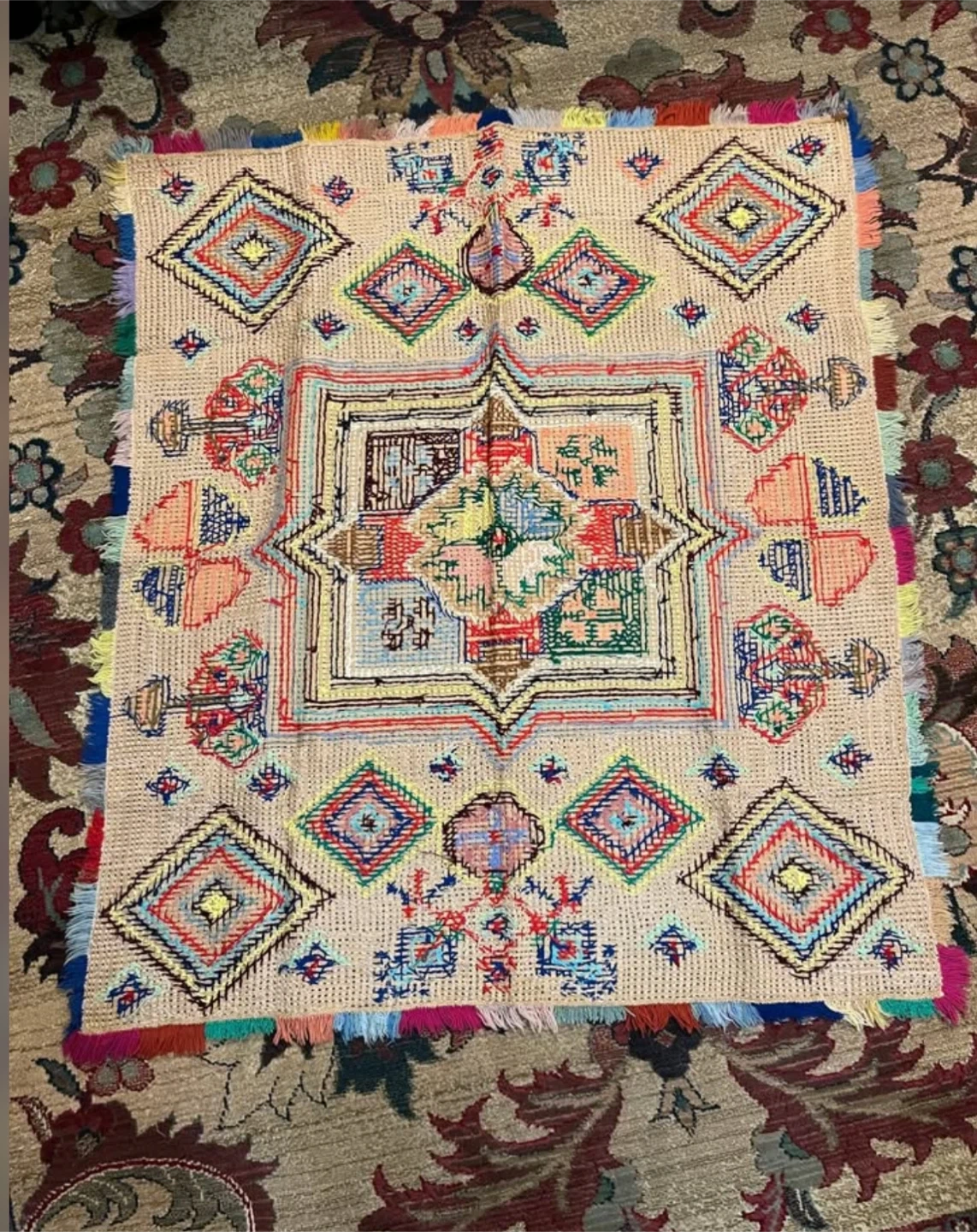 It's intricately embroidered with colourful geometric patterns. The edges feature a fringe detail. This piece would make a beautiful wall accent!