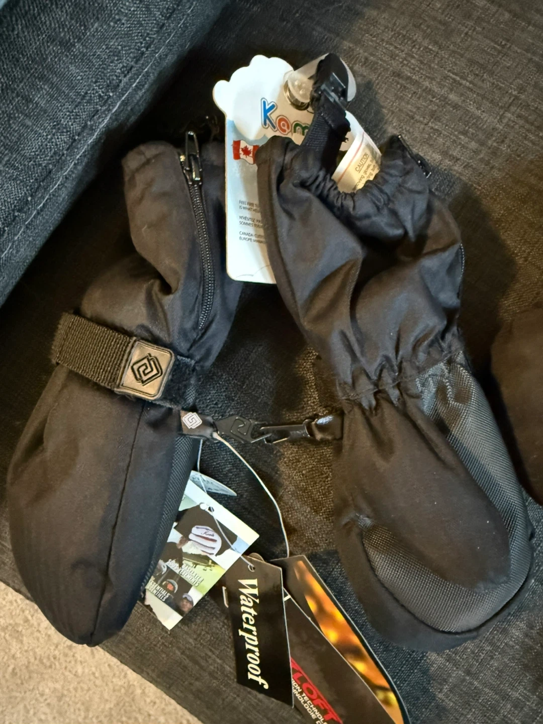 Keep your little one warm with these black Kombi mittens! They're waterproof, so perfect for snowy days and outdoor adventures. The mittens are designed for kids/children and feature a convenient zipper and adjustable strap for a secure fit