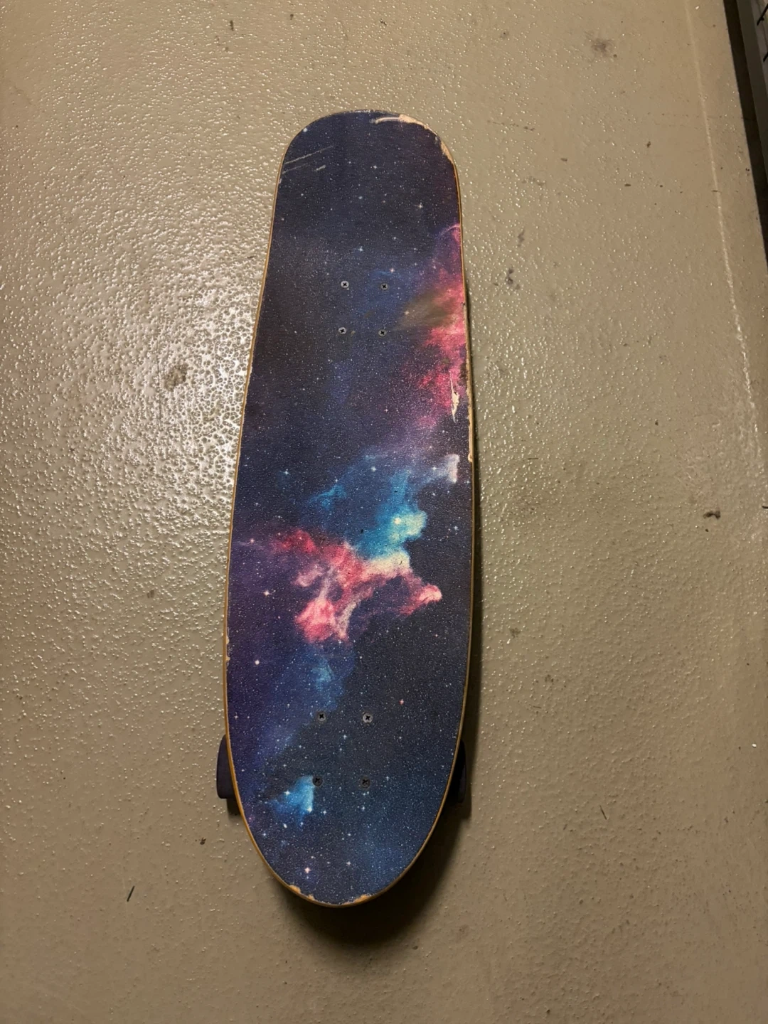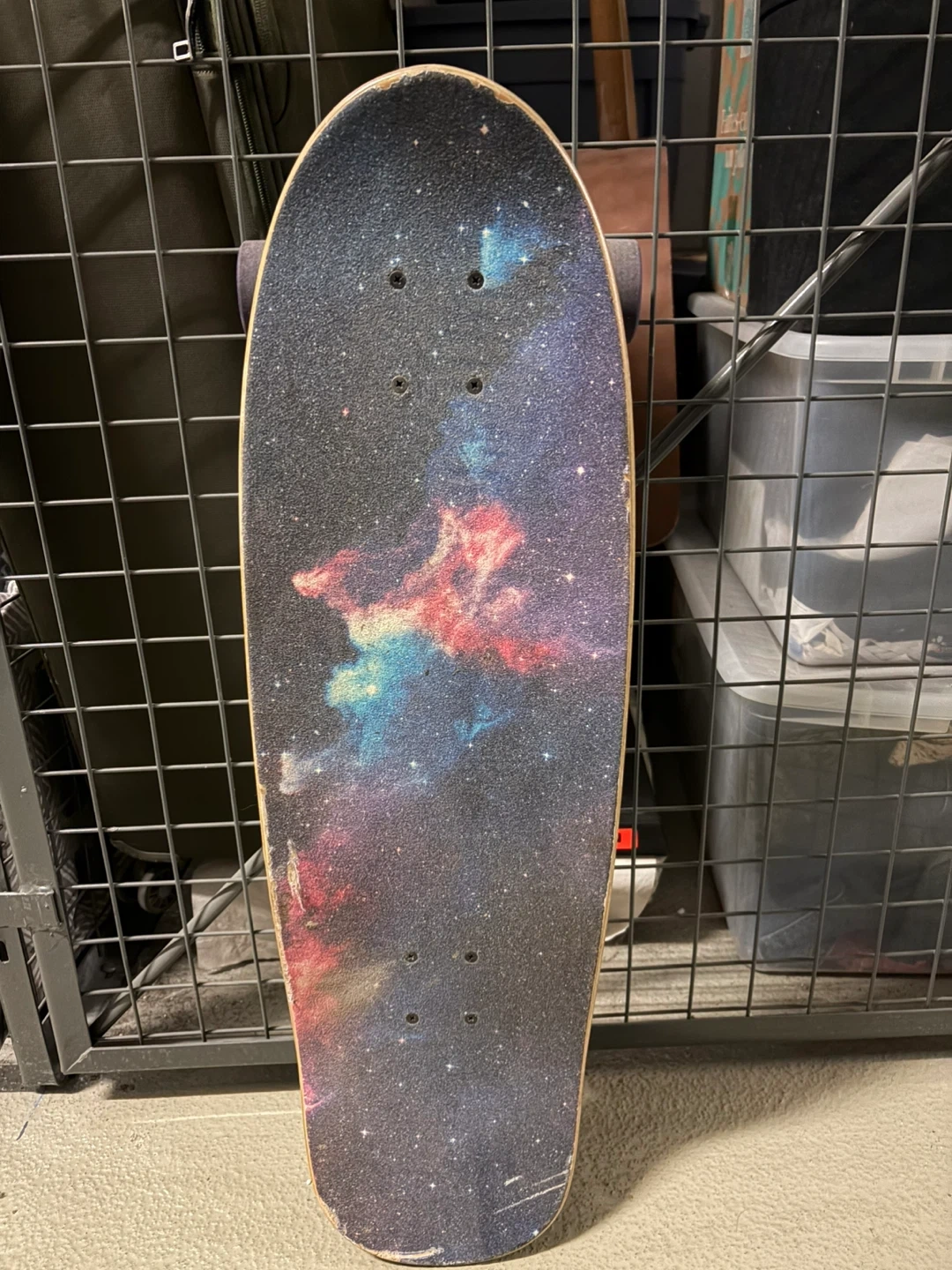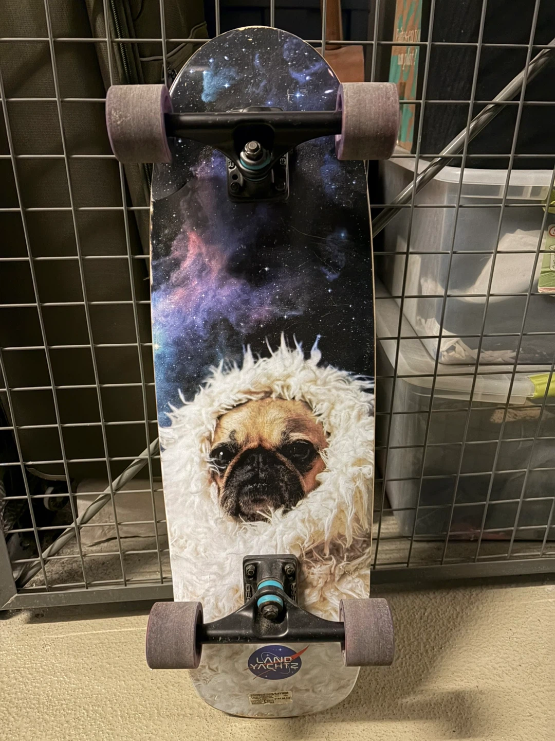 Selling a Land Yachtz skateboard with a cool galaxy design on the grip tape and a pug wearing a furry hood on the bottom! It's in good condition and ready to ride, has scratches as you can see in the pics (mainly on the top side).