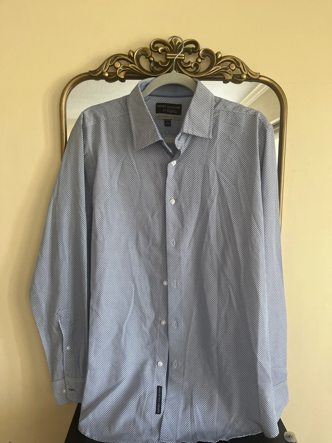 Brand new Button-up shirt in a blue and white pattern. The shirt features a collar. Great for an evening out where you want to feel relaxed.