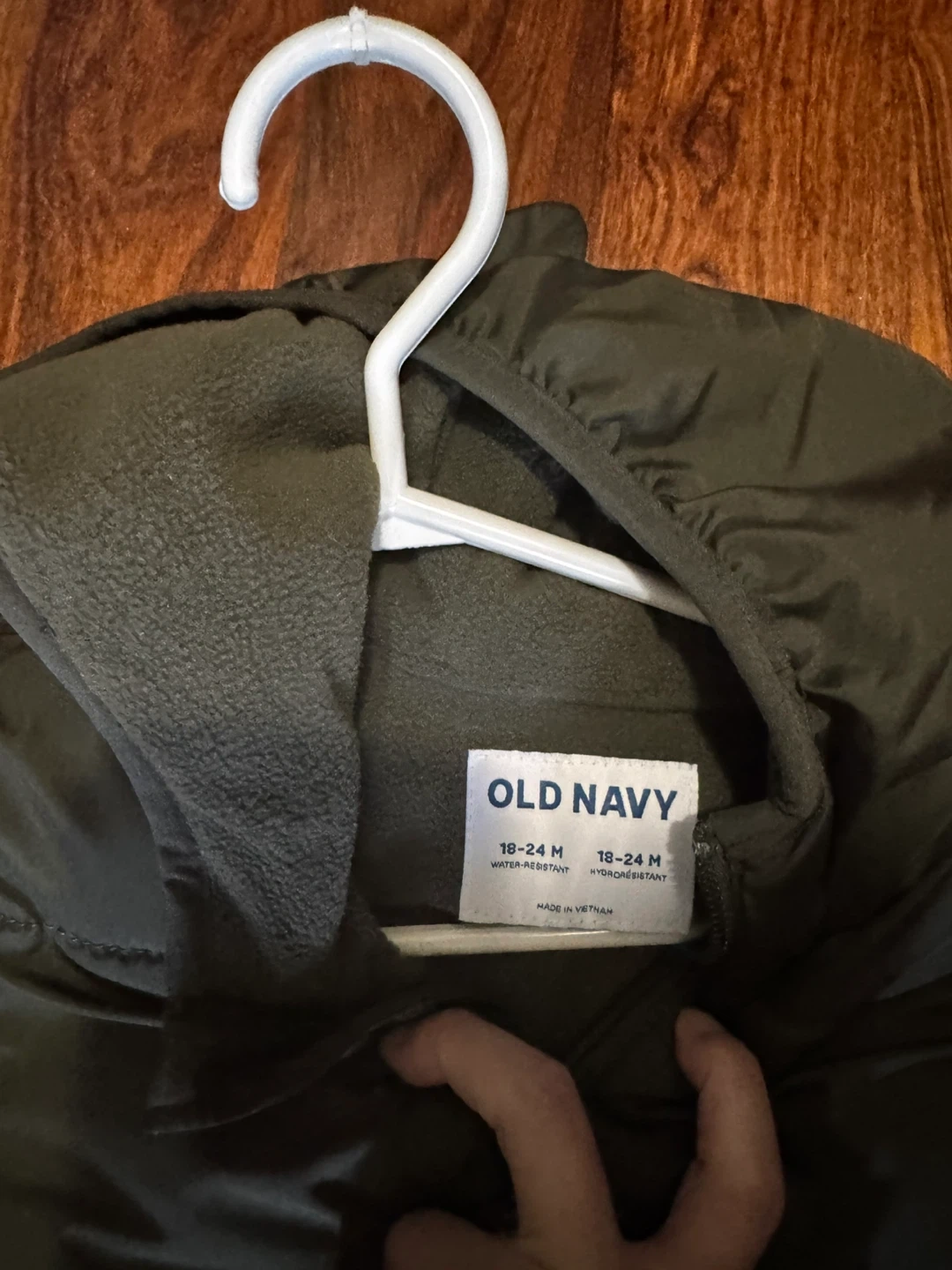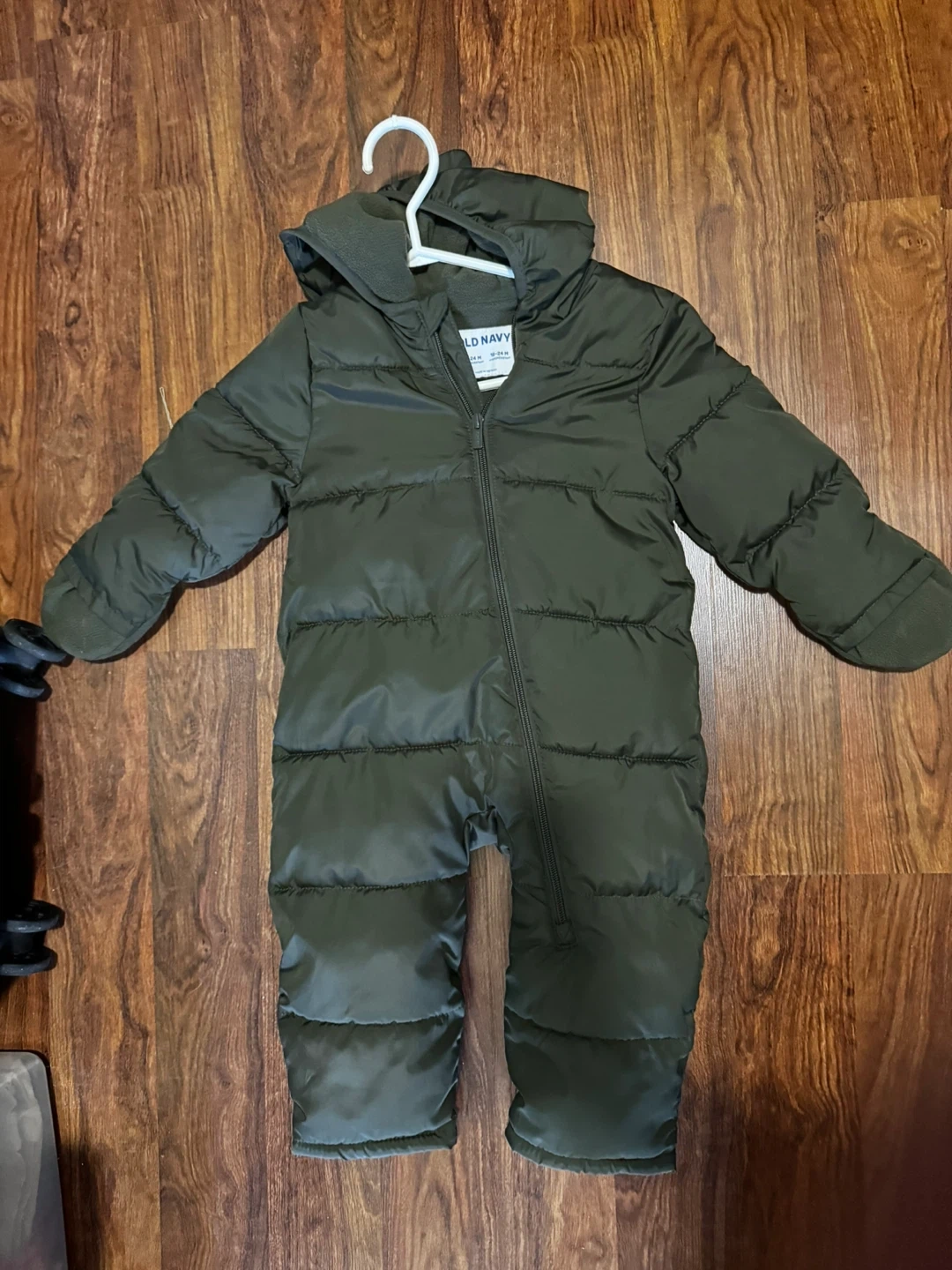 Old Navy puffer snowsuit in olive green. It's a size 18-24 months and water-resistant. Perfect for keeping your little one warm and dry during colder weather!