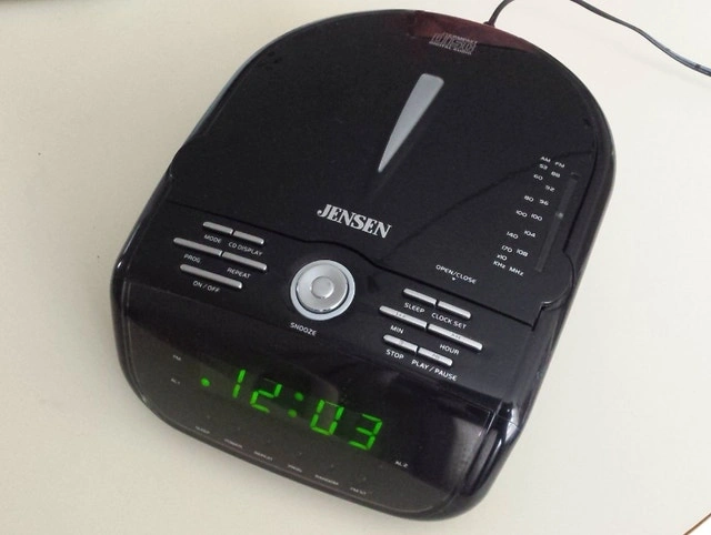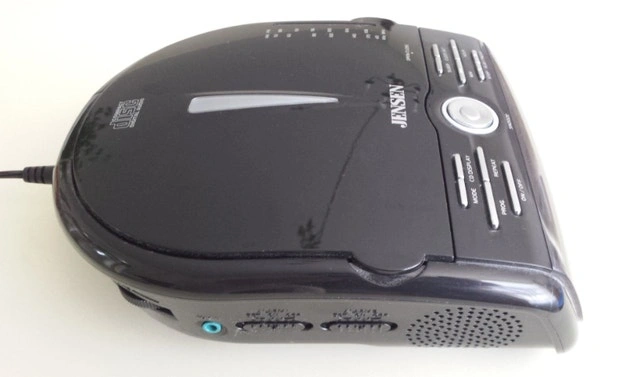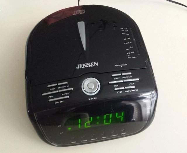 Clean. Works with radio, so you can wake up at ease, but CDs don't play. No scratches. Green LEDs. With power adapter. Approx. size 8" x 6".