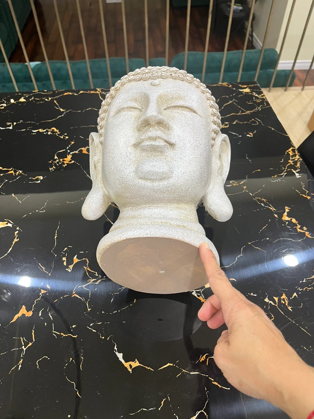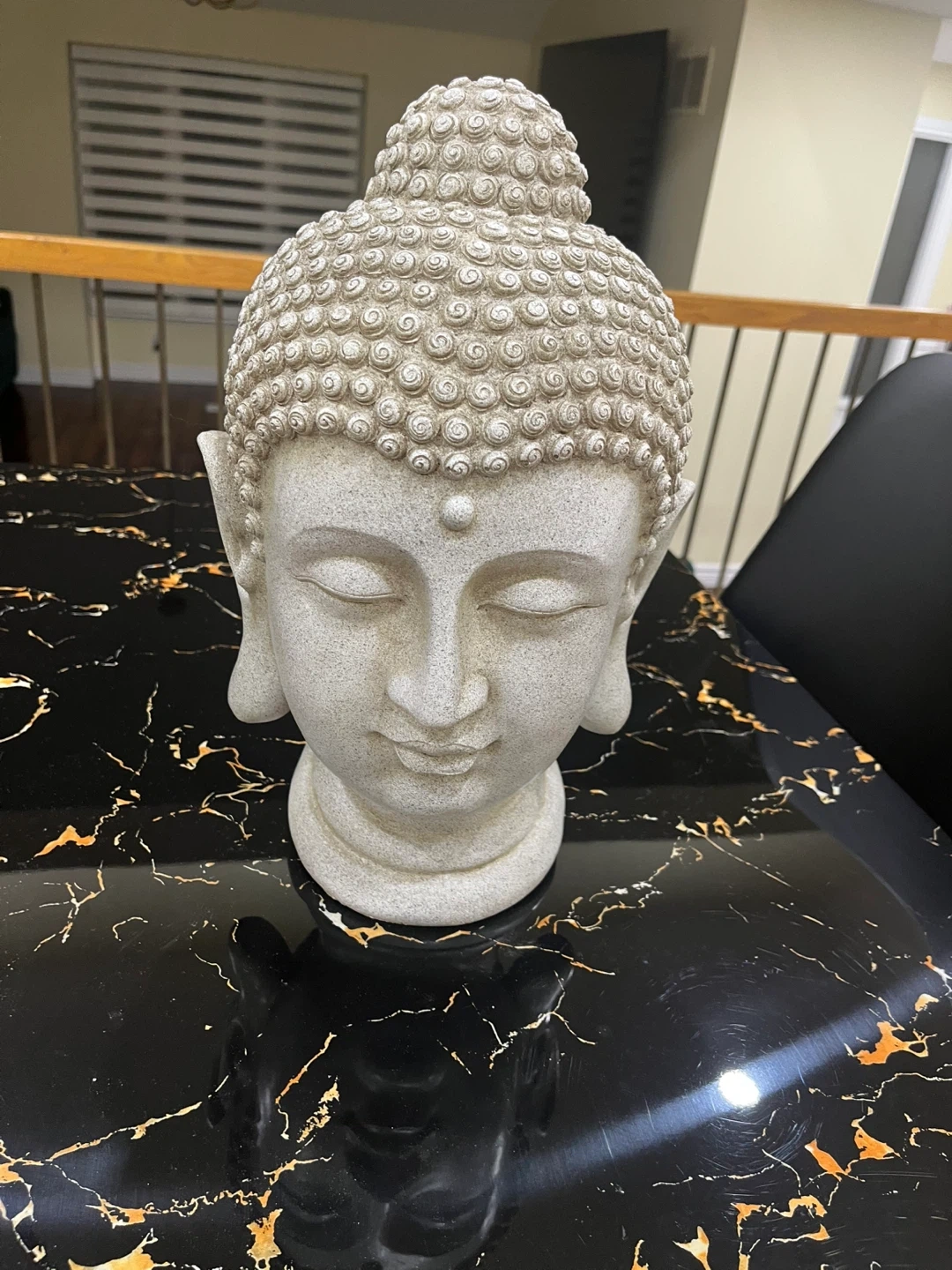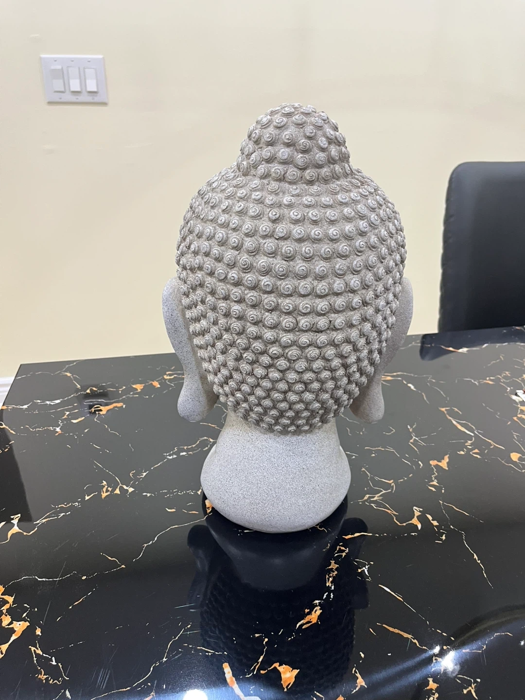 Add a touch of serenity to your home with this Buddha head statue! It's perfect for any room and brings a calming vibe. The statue is about 11 inches tall, making it a great size for a bookshelf or table. It's in great condition and ready to find a new home