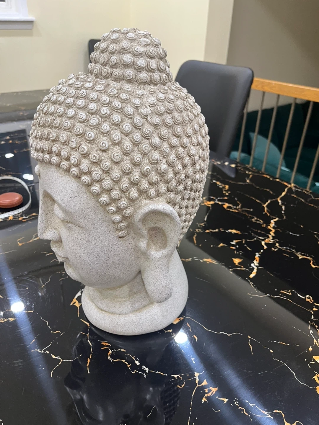 Add a touch of serenity to your home with this Buddha head statue! It's perfect for any room and brings a calming vibe. The statue is about 11 inches tall, making it a great size for a bookshelf or table. It's in great condition and ready to find a new home