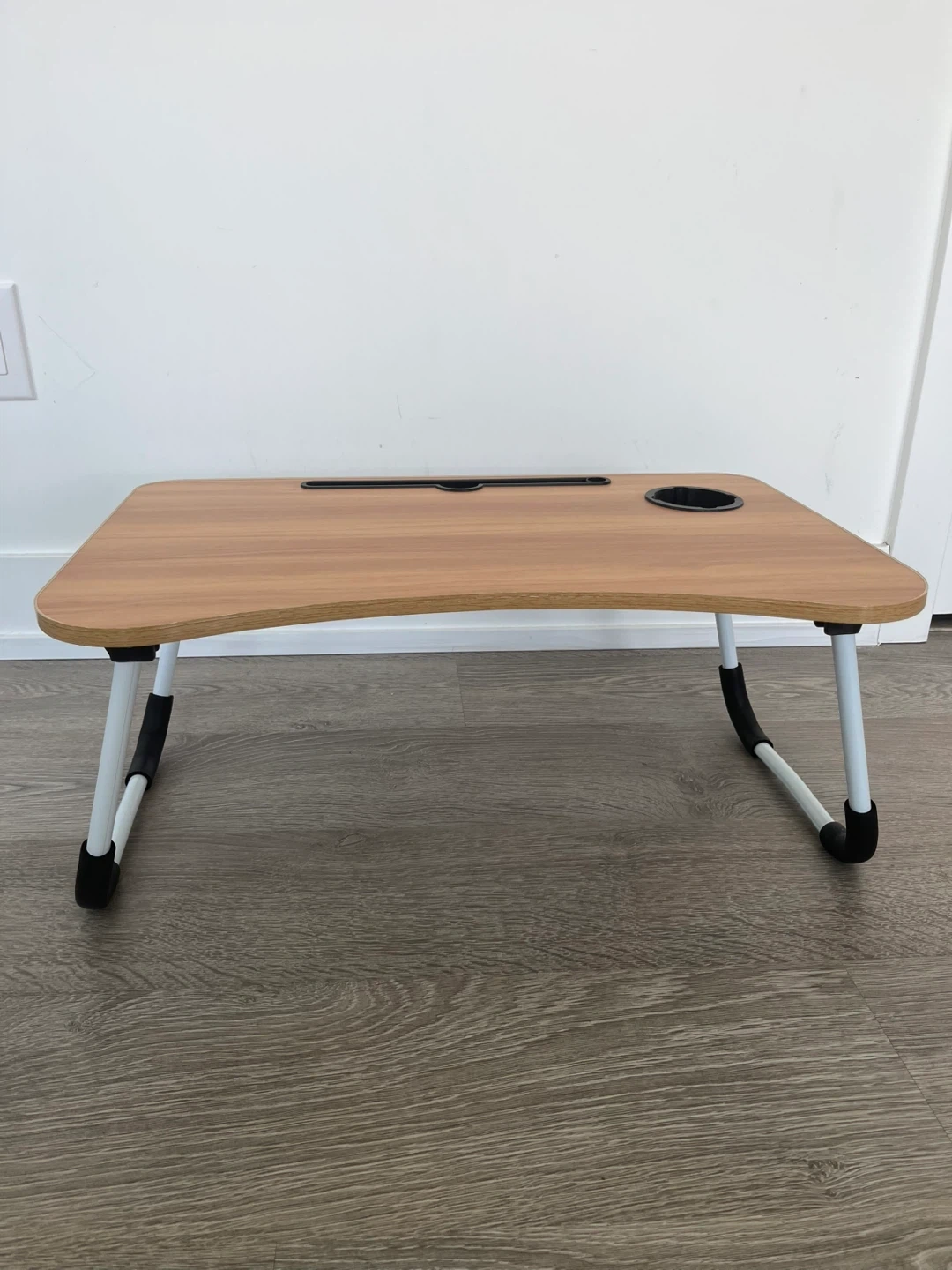 Handy lap desk table with foldable legs for easy storage. It's designed with a slot for a tablet or phone and a built-in cup holder. Perfect for working or snacking from your couch or your bed.