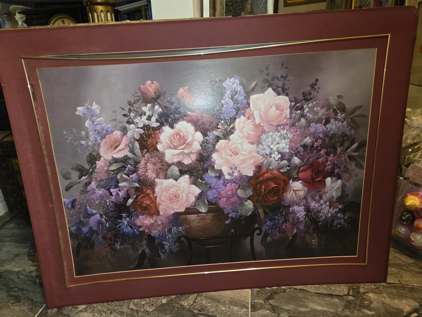 This is a framed print featuring a vibrant floral still life arrangement. The artwork depicts a lush bouquet of roses and other flowers in various shades of pink, red, and purple, set against a muted background. It's framed with a burgundy matting and a gold trim. Signed "V. Santos" on the lower left corner.