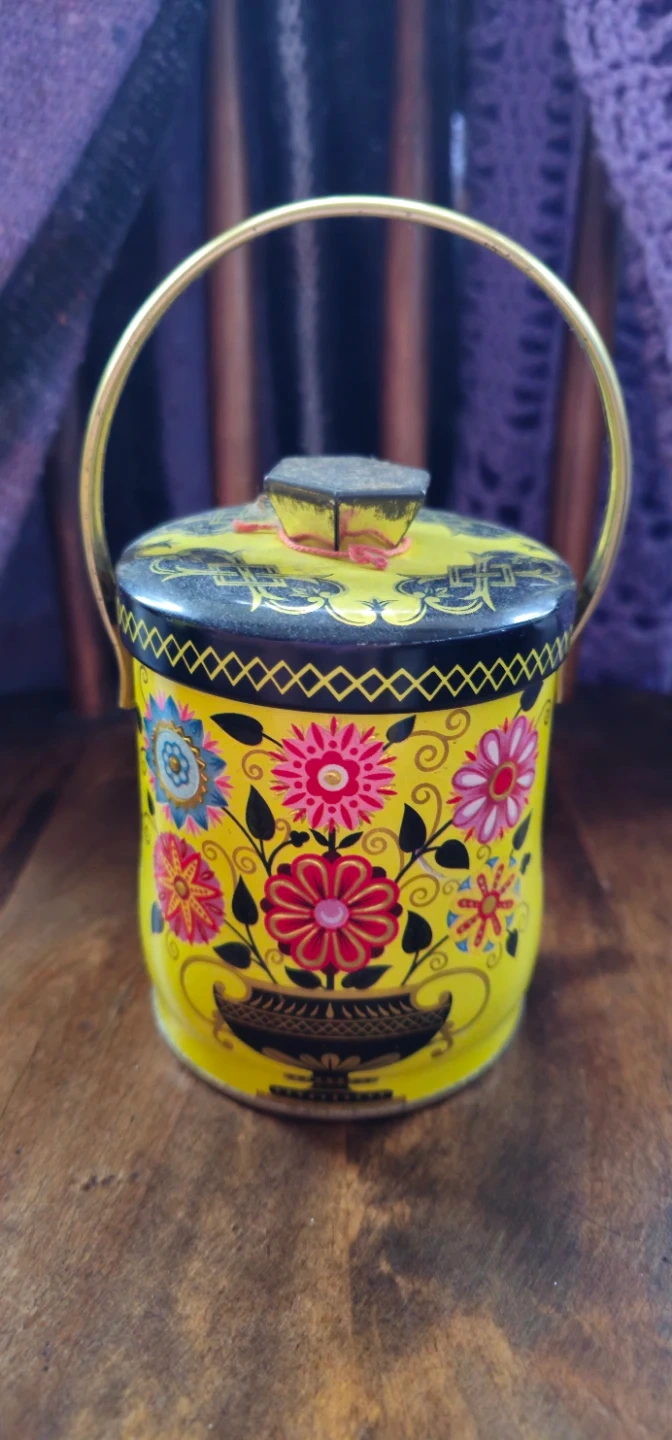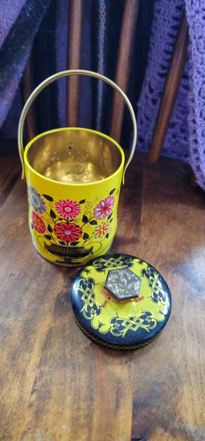 A charming yellow tin featuring a vibrant floral design and a sturdy handle. It includes a matching lid with decorative accents. This tin is perfect for storing small items or as a decorative piece.