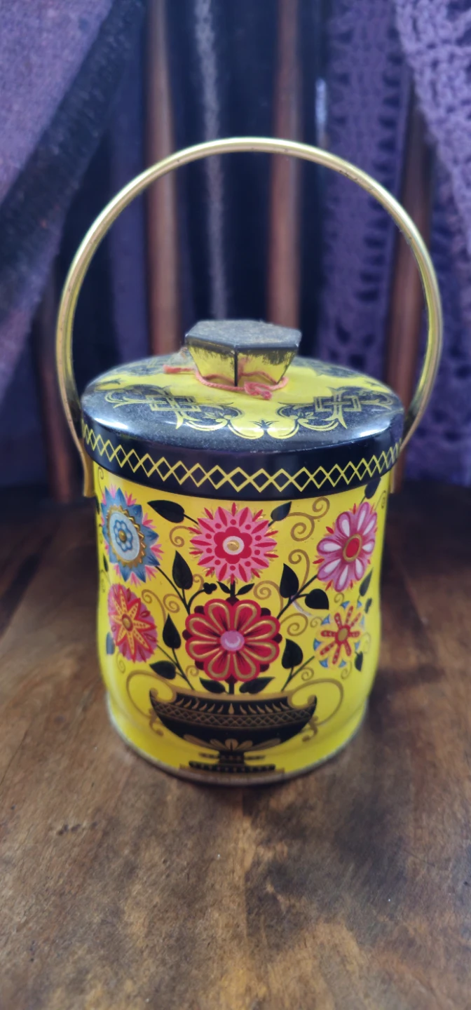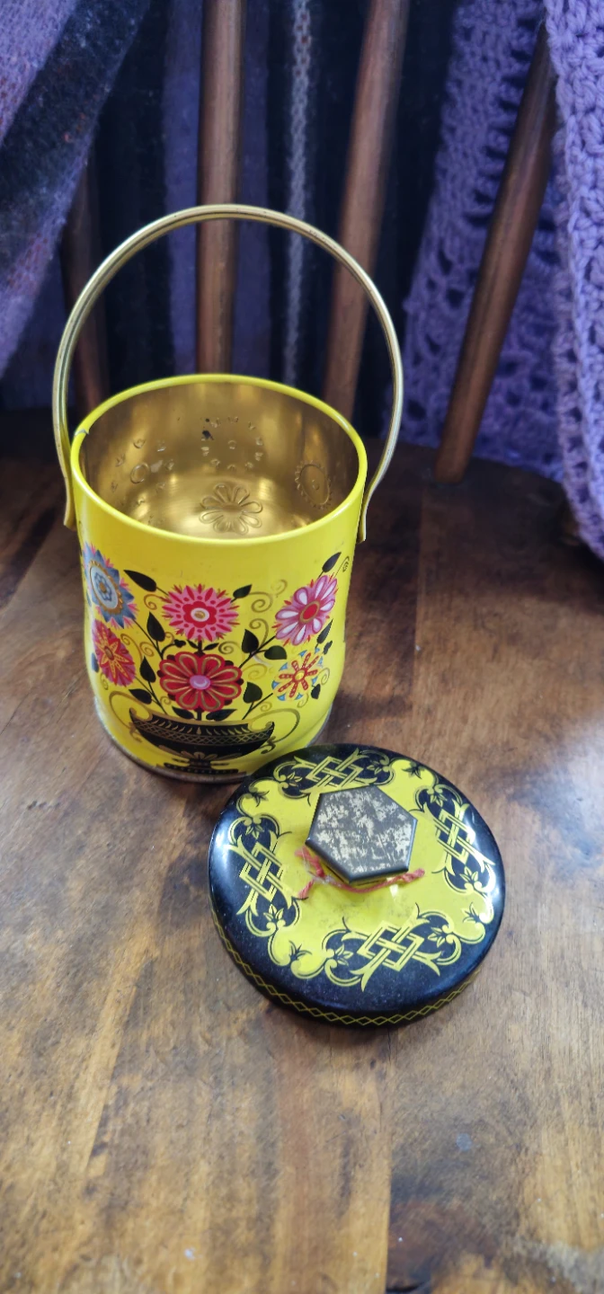 A charming yellow tin featuring a vibrant floral design and a sturdy handle. It includes a matching lid with decorative accents. This tin is perfect for storing small items or as a decorative piece.